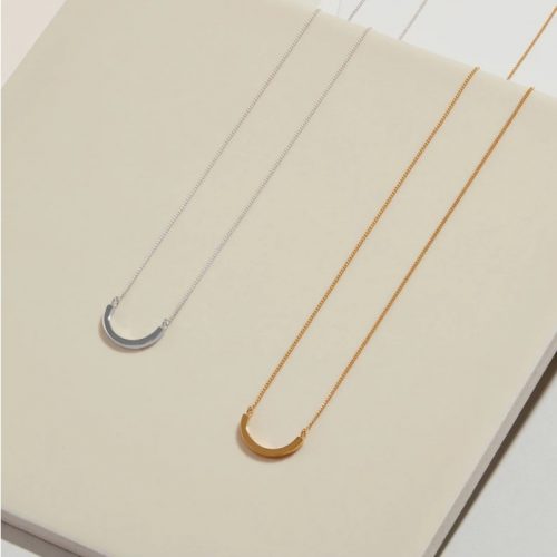 Crafted from sterling silver, the geometric arc necklace with a high polish which adds the perfect accent to a minimalist look. This stackable pendant necklace is a contemporary addition to any jewelry box collection.
