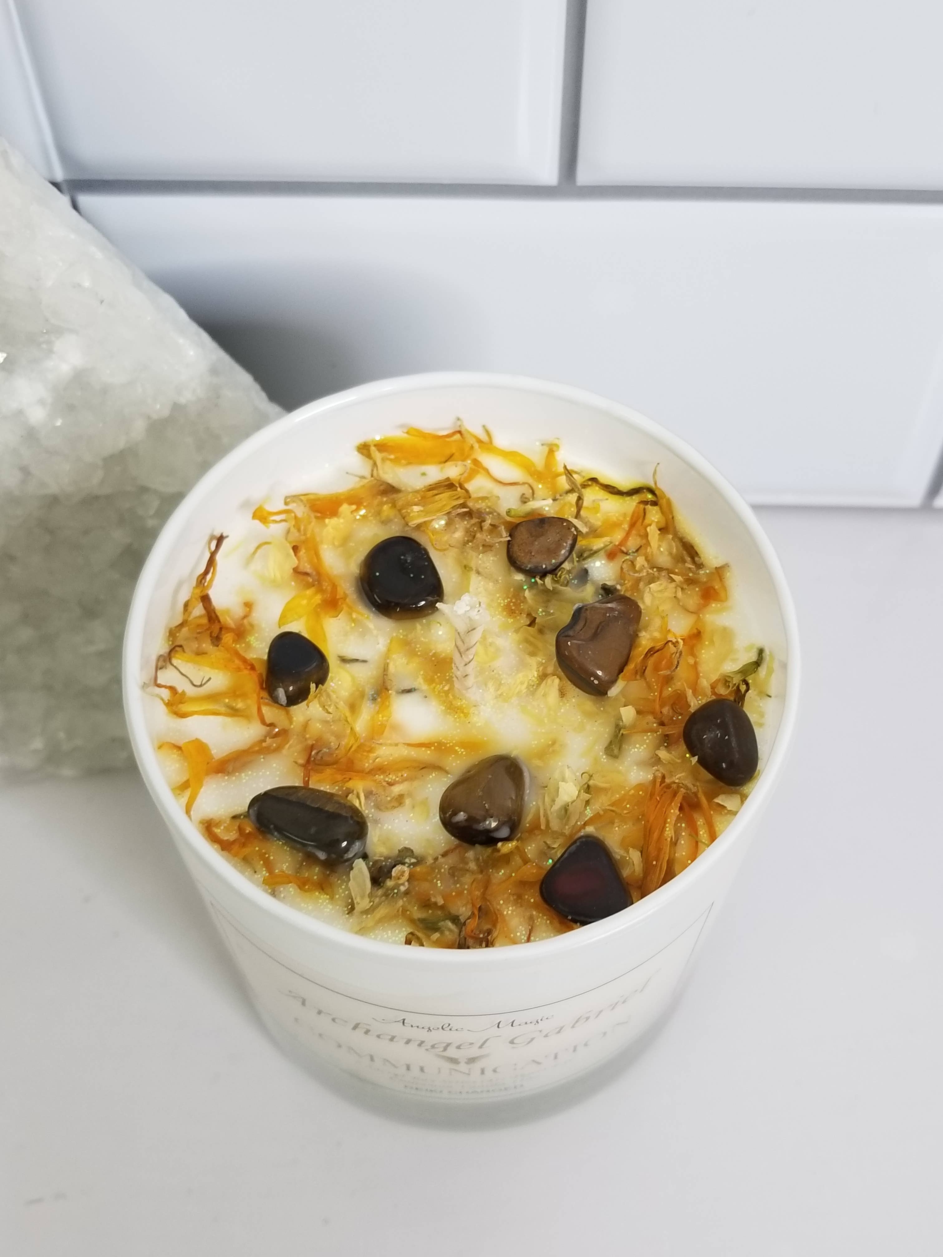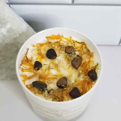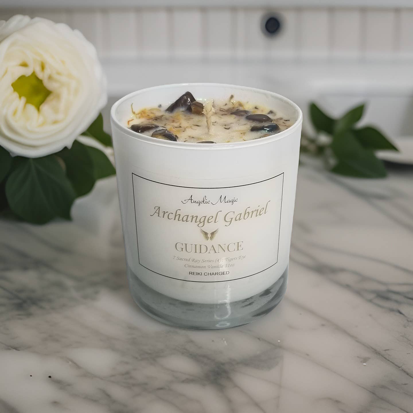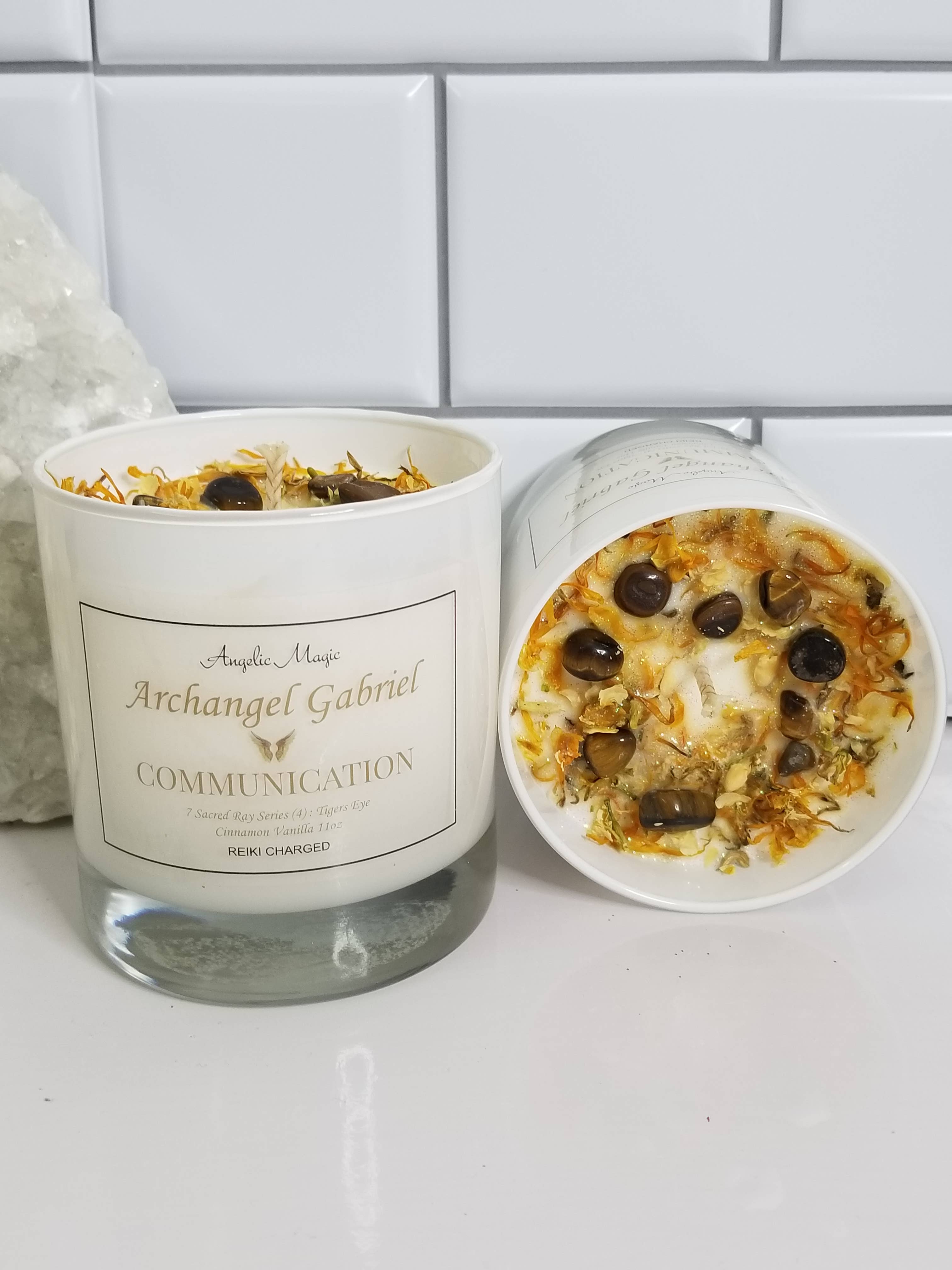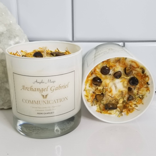 100% Natural Soy CandleScent Cinnamon and VanillaReiki ChargedCotton WickCrystal Tigers EyeRose Gold Jar LidTiger’s Eye represents the power, courage, and fearlessness of the tiger, worshipped throughout history and across the world. Tiger’s Eye is a member of the Quartz family and has been revered for centuries. Tiger’s Eye is the stone of courage, power, and protection.Archangel Gabriel helps those who are messengers—including teachers, writers, musicians, and artists—and helping parents conceive, adopt, and raise their children.