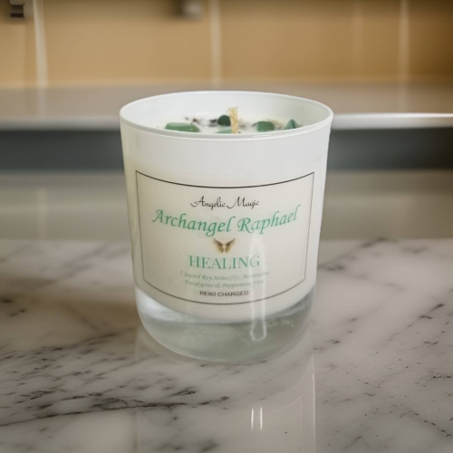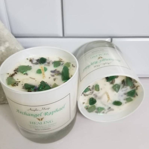100% Natural Soy CandleCotton WickScent Eucalyptus & PeppermintReiki ChargedCrystal Aventurine Sage HerbRose Gold Jar LidArchangel Raphael is known as the angel of healing. He works to heal people’s minds, spirits, and bodies so they can enjoy peace and good health to the fullest extent of God’s will for them.Aventurine has an anti-inflammatory effect and eases skin eruptions, allergies, migraines, and soothes the eyes. It heals lungs, sinuses, heart, muscular and urogenital systems.Aventurine shines when it comes to mental and emotional healing.