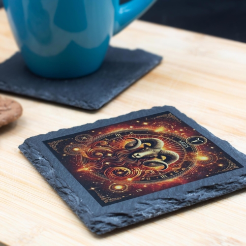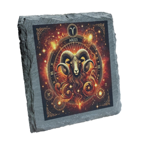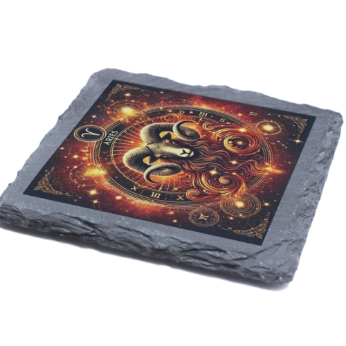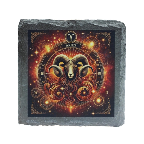 Ignite your space with the fiery energy of Aries! This stunning Zodiac Slate Coaster showcases the commanding presence of the Aries ram, surrounded by a blazing cosmic design that highlights their courageous and spirited nature. Perfectly capturing the essence of this zodiac sign, this coaster is a unique blend of practicality and artistry. Crafted from premium natural slate, it exudes a rustic charm while being robust and functional. Its protective anti-slip backing ensures surfaces remain safe from stains and scratches, making it both a decorative and practical choice. Whether you’re treating yourself or surprising an Aries loved one, this coaster is a bold statement piece that celebrates the fearless spirit of the Aries sign. Vibrant Aries Artwork: Features the powerful Aries ram surrounded by a cosmic, fiery glow, symbolizing energy and determination. Premium Natural Slate: Made from durable, eco-friendly slate with a rustic edge for an elegant, natural look. Astrology Loverâs Must-Have: Ideal for Aries individuals (March 21 – April 19) who embrace their bold and confident zodiac traits. Practical and Decorative: Protects surfaces while adding a striking zodiac-inspired touch to any home or office decor. Anti-Slip Backing: Equipped with non-slip pads to ensure stability and surface protection.