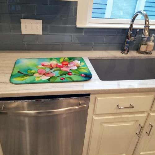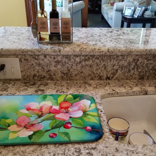Dish Drying Mat featuring breed specific Arkansas Apple Blossom artwork. Say goodbye to messy countertops and soggy dish towels with our innovative dish drying mat. Our high-quality dish drying pad is designed to keep your countertops dry while offering a stylish and efficient solution. Whether you’re air drying dishes, glasses, stemware, silverware, pots, pans, bottles, or even fruits and vegetables, our dish mat is the perfect choice. The 14 inches x 22 inches size fits most counters and dish drying racks, and the non-slip design ensures stability. Made with water-absorbent polyester and a polyurethane foam insert, our dish drying mat is not only functional but also durable. It’s machine washable and printed in the USA for long-lasting use. The beautiful artwork adds flair to your kitchen decor, making it a perfect housewarming gift or present for any occasion. Upgrade your kitchen experience with our absorbent and versatile dish drying mat.