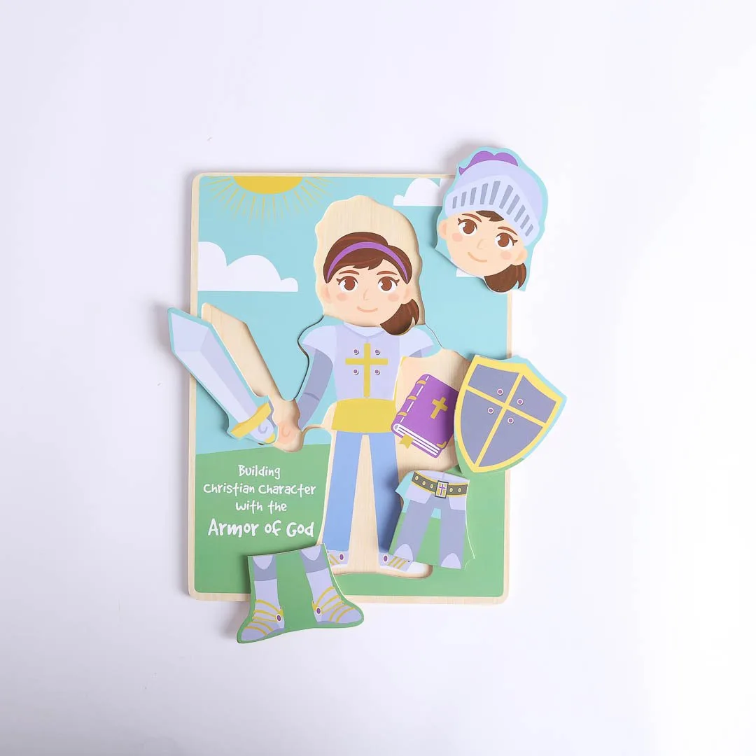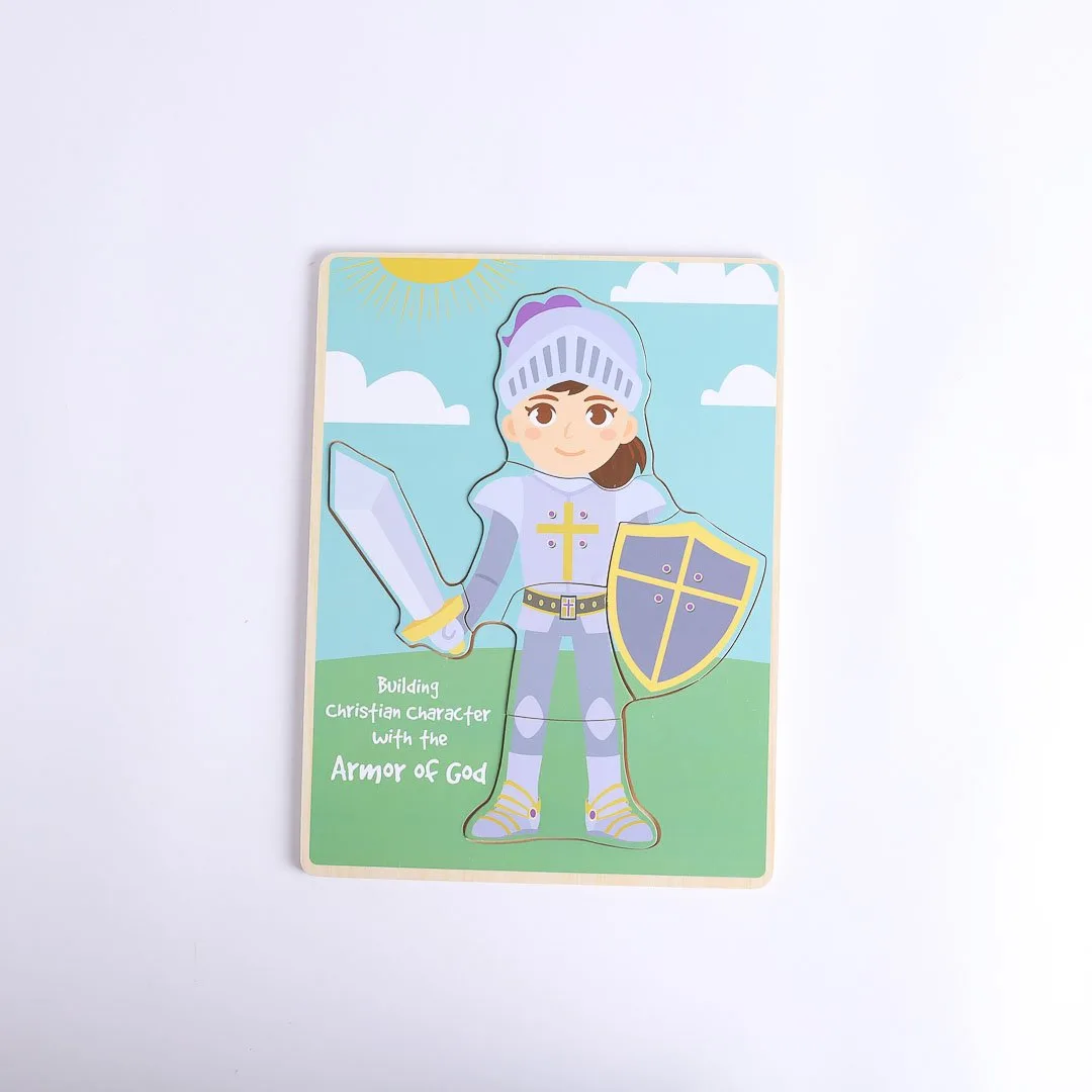 This full color 6 piece puzzle is perfect for young children to begin learning about the armor of God from the very beginning. This unique, wooden puzzle is one of our favorites because you can use the young girl puzzle for a daughter or granddaughter and the young boy puzzle for your son or grandson! Inspire courage, creativity, and hand-eye-coordination for little ones with the armor of God puzzles!This full color 6 piece puzzle is perfect for young children to begin learning about the armor of God from the very beginning. This unique, wooden puzzle is one of our favorites because you can use the young girl puzzle for a daughter or granddaughter and the young boy puzzle for your son or grandson! Inspire courage, creativity, and hand-eye-coordination for little ones with the armor of God puzzles! Made of smooth, sturdy wood with sanded and rounded edges, this puzzle is perfectly safe for babies, toddlers, and young children to play with. Measuring 11.75 x 8.75 x .25, this puzzle is the perfect size for little hands to grasp and manipulate. Each piece is easy for children to pick up and move, enhancing their fine motor skills and dexterity. Our wooden block puzzle is not only a fun toy for kids to play with but also an excellent tool for parents and educators to use in teaching young children about the Armor of God. With its vibrant colors and durable construction, this puzzle is sure to provide hours of entertainment and learning for your little ones.