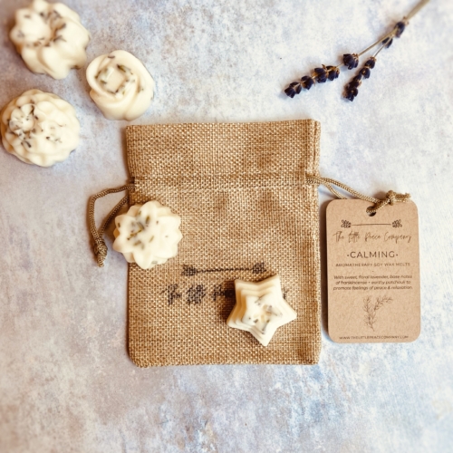 Contains 4-5 x large aromatherapy wax melts in a reusable burlap bag.