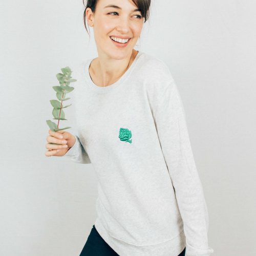 Artichoke lightweight sweat-shirt made of 100% organic cotton, 180 gsm. Pair it with your favourite high-waisted jeans and sneakers or a skirt. Features: Soft-touch jersey / Not brushed inside. Relaxed fit. Crew neck. Color : heather Ash. Long sleeves. Ribbed cuffs. Model wears Small size. Model hight: 173cm / 5’8″. Our recommendations: Wash inside out with similar colors at 30°C. Iron inside out at low to medium temperature. No bleaching. Do not iron on decoration directly