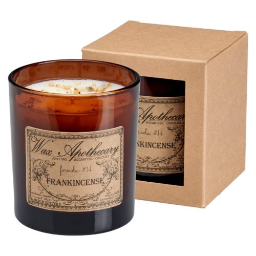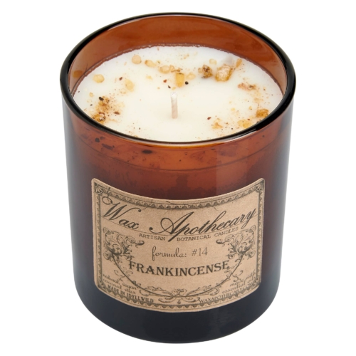 9 oz botanical candle in amber glass with box. Frankincense has a rich, resinous aroma with hints of citrus, pine, and woody undertones. Its fragrance is earthy, warm, and calming, creating a sense of tranquility and spiritual depth. Frankincense Aromatherapy Notes: uplifting, antidepressant, relaxing and revitalizing 9 oz vegan candle is handmade with 100% plant-based wax, natural fragrance derived from essential oil, & blended with dried botanicals then hand poured into an artisan-made amber glass tumbler. Cotton wick is used for clean burning & natural white color of wax so there is no color dye is added. All of our candles are Phthalate free.3″ Diameter x 3.25″ Height Burn time: 50 + hours-Made in the USA