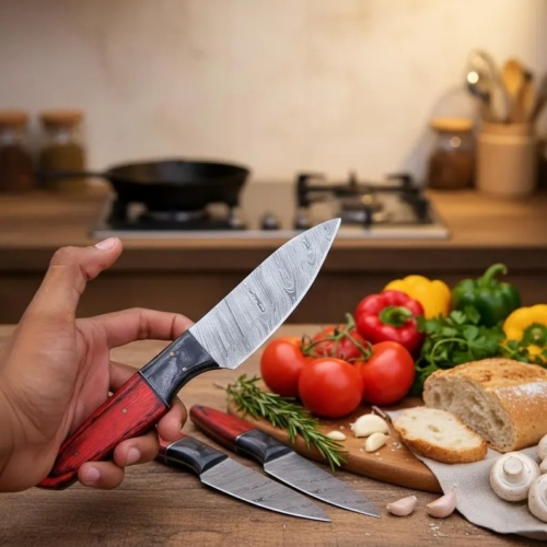 Upgrade your kitchen with this Artisan Damascus Steel Chef Knife Set, meticulously hand-forged for exceptional sharpness, balance, and durability. Crafted from premium Damascus steel, each blade features a stunning, unique pattern. The red wood handles provide ergonomic comfort and precise control for effortless slicing and chopping.