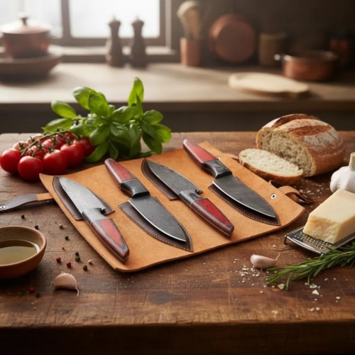All knives come with a leather roll kit for safe storage and travel.