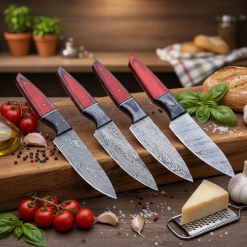 Upgrade your kitchen with this Artisan Damascus Steel Chef Knife Set, meticulously hand-forged for exceptional sharpness, balance, and durability. Crafted from premium Damascus steel, each blade features a stunning, unique pattern. The red wood handles provide ergonomic comfort and precise control for effortless slicing and chopping.