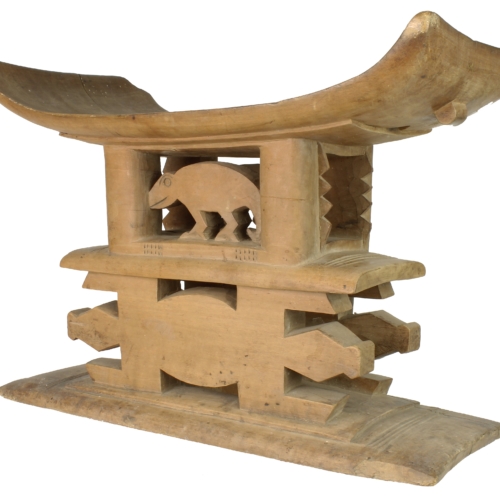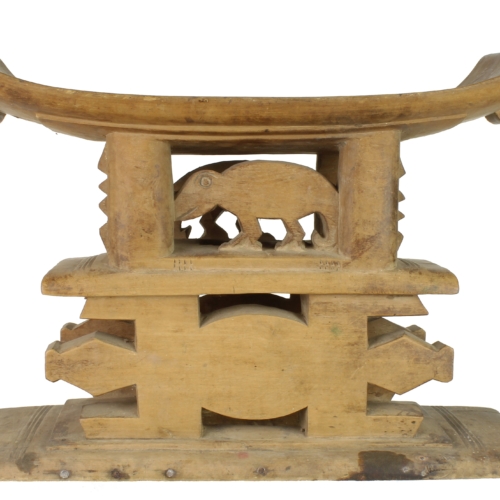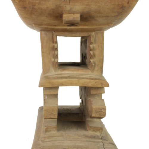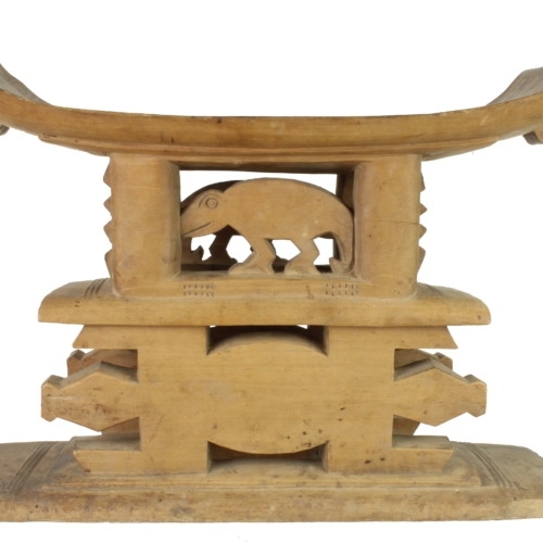 This stool was probably made as one of a pair, together with item ASP-1.1 on this site. Clearly they were both carved by the same hand, as is said, meaning by the same person. Although they can be purchased as a pair we also sell them separately. We are unable to determine their age but we estimate that they are between 50 and 100 years old. Both are in excellent condition, having been well cared for by their owners who clearly prized their possession highly. Akan Peoples, including the Asante, do not carve ancestor figures. Instead, the stool upon which a person habitually sits is believed to become imbued with his spirit over time and use, and, if the stool owner is a royal, clan or family head, becomes a means of contacting his spirit after his death. Stools are carved from one piece of sese wood, carved green and unseasoned. A ruler’s stool may be larger and have a highly decorated support connecting the flat rectangular base and crescentic seat, as do these two “double decker” stools. This type of stool, with one animal or even a scene with many human figures on top of another animal or scene with multiple figures appears at least as far back as 1874 in Asante art. The theme is loosely called “someone sits on someone else in life”, meaning that social ranks are not equal: a ruler has more power than the common man. For this reason, “double decker” stools have traditionally been used by rulers. These stools feature animals and birds. Both have crocodiles, a well-known power symbol, as the lower figure. In the interest of symmetry, the crocodile on this stool has a head at each end. Above the “double-headed” crocodile is a chameleon, which is associated with slow, steady but sure progress toward an objective—a good quality for a ruler to have. This stool thus comments upon both power and perseverance of its owner, but values perseverance over sheer power. We are grateful to Dr. Martha J. Ehrlich, Professor Emerita of Art History, Southern Illinois University at Edwardsville (SIUE), for providing this very valuable explanation.