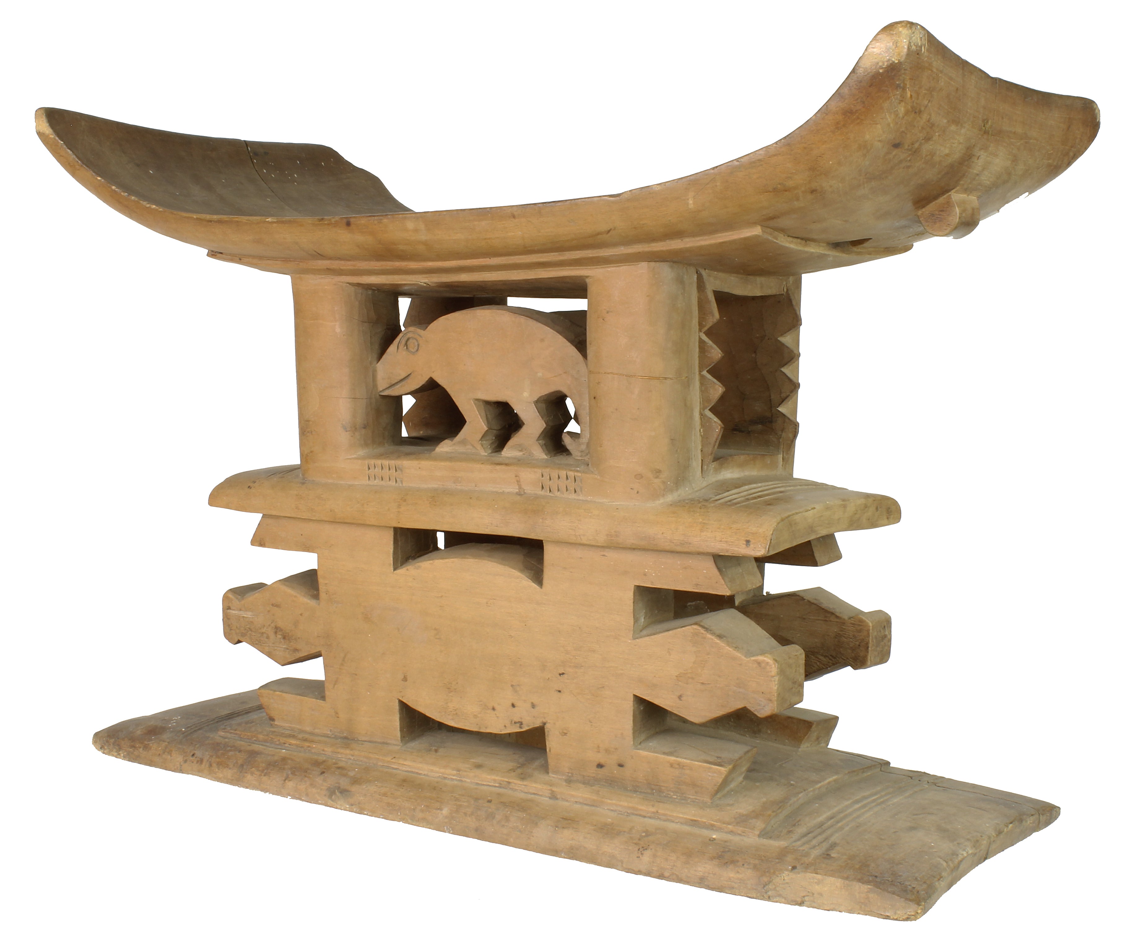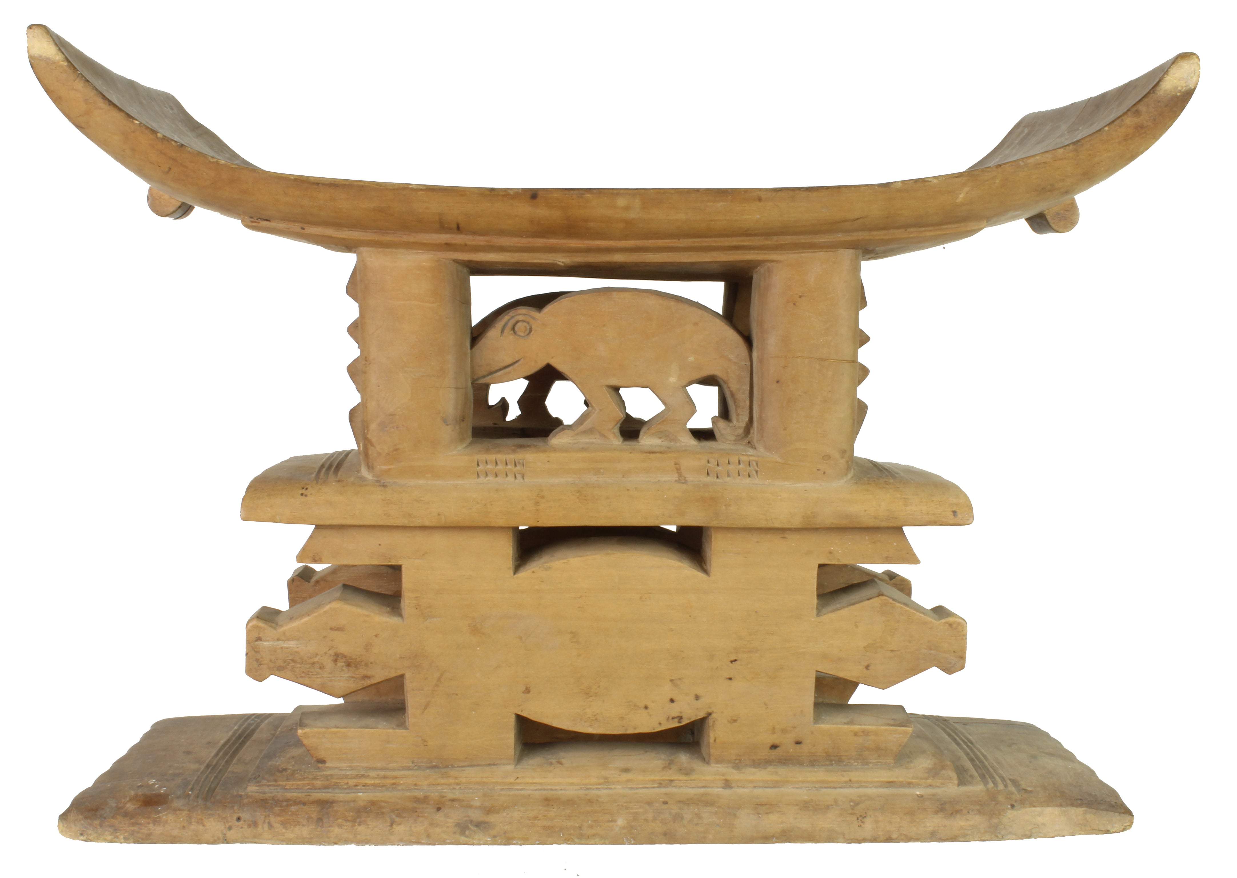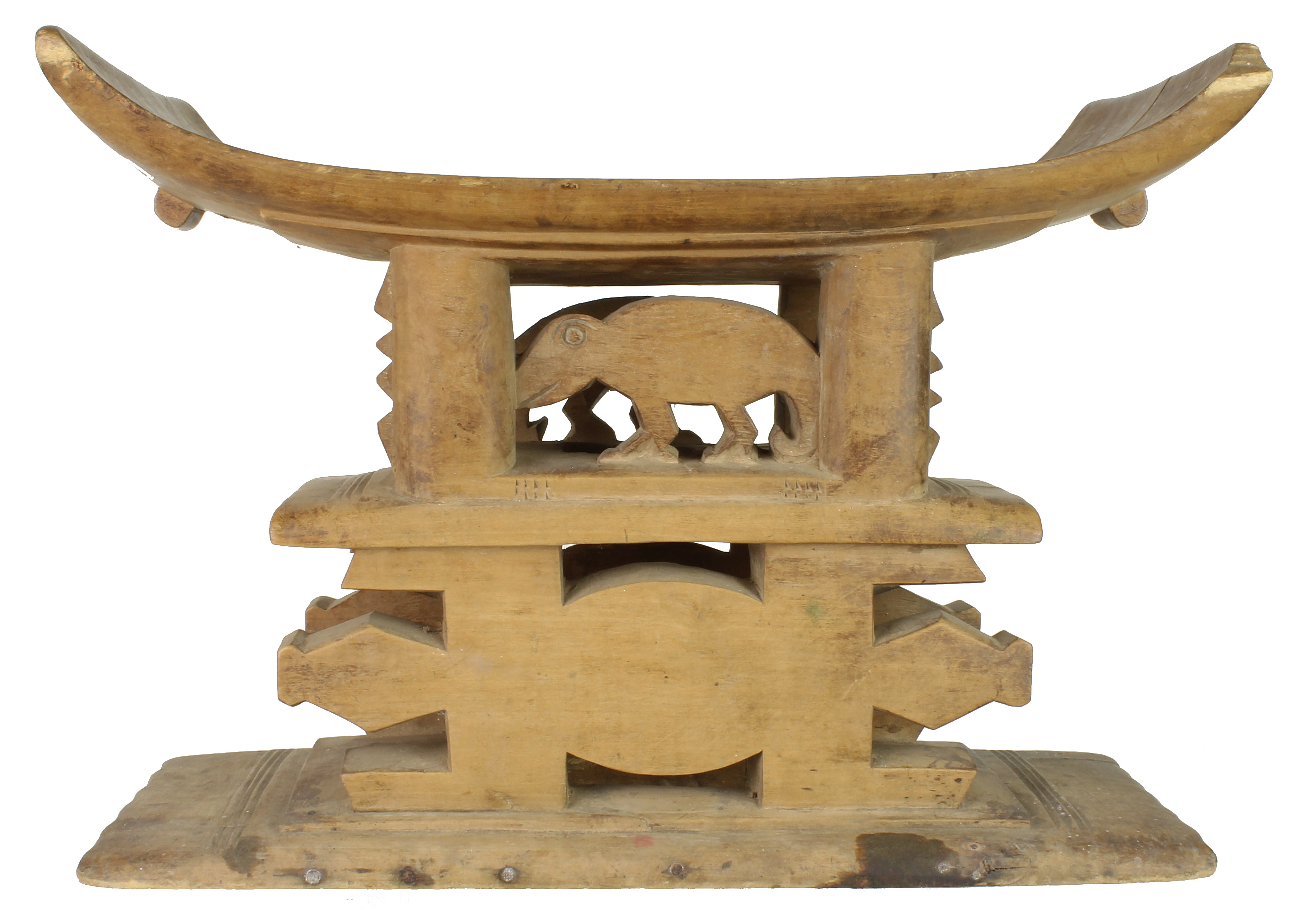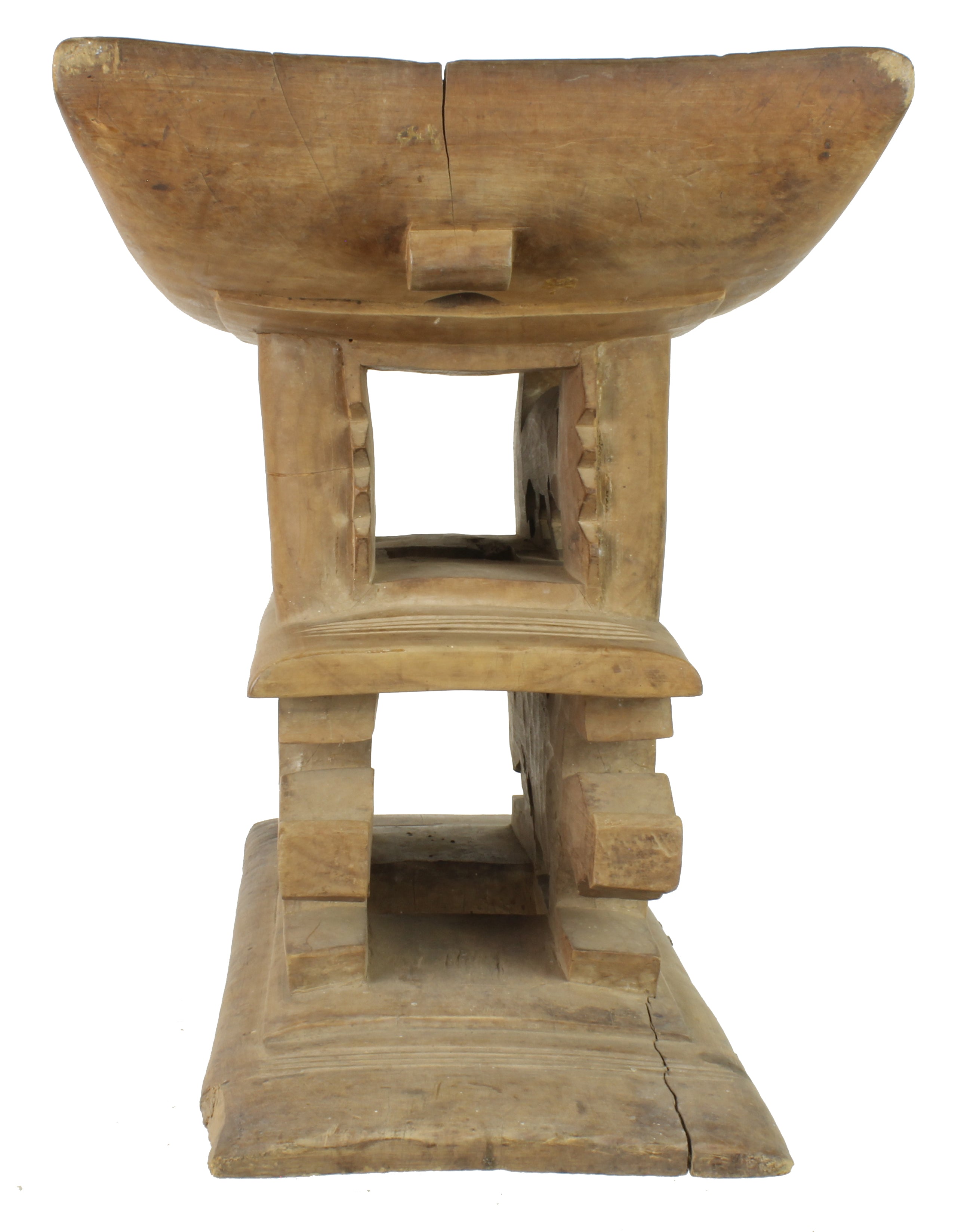 This stool was probably made as one of a pair, together with item ASP-1.1 on this site. Clearly they were both carved by the same hand, as is said, meaning by the same person. Although they can be purchased as a pair we also sell them separately. We are unable to determine their age but we estimate that they are between 50 and 100 years old. Both are in excellent condition, having been well cared for by their owners who clearly prized their possession highly. Akan Peoples, including the Asante, do not carve ancestor figures. Instead, the stool upon which a person habitually sits is believed to become imbued with his spirit over time and use, and, if the stool owner is a royal, clan or family head, becomes a means of contacting his spirit after his death. Stools are carved from one piece of sese wood, carved green and unseasoned. A ruler’s stool may be larger and have a highly decorated support connecting the flat rectangular base and crescentic seat, as do these two “double decker” stools. This type of stool, with one animal or even a scene with many human figures on top of another animal or scene with multiple figures appears at least as far back as 1874 in Asante art. The theme is loosely called “someone sits on someone else in life”, meaning that social ranks are not equal: a ruler has more power than the common man. For this reason, “double decker” stools have traditionally been used by rulers. These stools feature animals and birds. Both have crocodiles, a well-known power symbol, as the lower figure. In the interest of symmetry, the crocodile on this stool has a head at each end. Above the “double-headed” crocodile is a chameleon, which is associated with slow, steady but sure progress toward an objective—a good quality for a ruler to have. This stool thus comments upon both power and perseverance of its owner, but values perseverance over sheer power. We are grateful to Dr. Martha J. Ehrlich, Professor Emerita of Art History, Southern Illinois University at Edwardsville (SIUE), for providing this very valuable explanation.