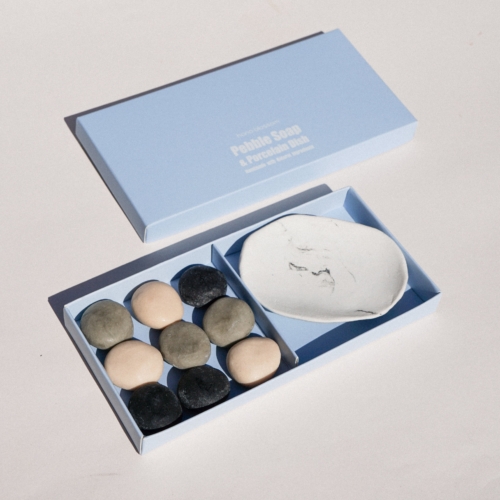 Assorted handmade soaps in a small natural pebble design. They look just like pebbles on the beach. Handmade with 100% natural ingredients and lemongrass essential oil, yet vegan and cruelty free. Thanks to a coconut oil base which helps lock in hydration. As a result the skin stays hydrated and supple after cleansing. Each soap is small but mighty. It can be used many times last longer than you can imagine. The set comes with a handmade white porcelain dish with a grey marble effect giving its unique character on its own. Ideal a great gift for any occasions and home use.