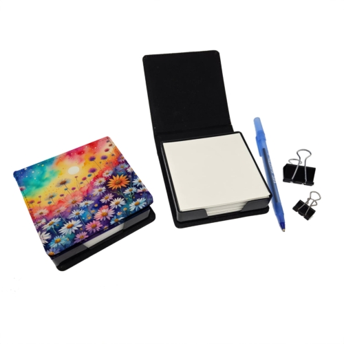 PU Leather Note Paper Holder featuring breed specific Asters artwork. Elevate your workspace with this PU Leather Note Paper Holder, crafted to resemble luxurious leather without the use of animal products. Made from durable synthetic PU leather, it offers both a premium look and eco-friendly appeal. This note holder, compactly sized at 4.25 x 4.25 x 1.25 inches, includes about 160 sheets of 3.75 x 3.75-inch note paper—ideal for quick notes and reminders. An exclusive artist-designed cover makes each holder uniquely vibrant, adding a splash of color and personality to any desk or office. The discrete design keeps note paper hidden, maintaining a neat and organized workspace. Perfect as a gift or for personal use, this stylish holder is refillable with standard paper, ensuring long-lasting utility. A must-have for anyone seeking a sophisticated, artful touch to their workspace while supporting animal-friendly products. Add style, organization, and creativity to your everyday routine with this elegant note paper holder.