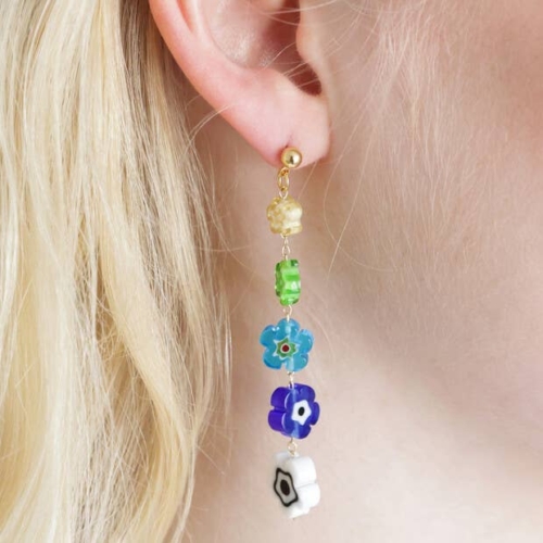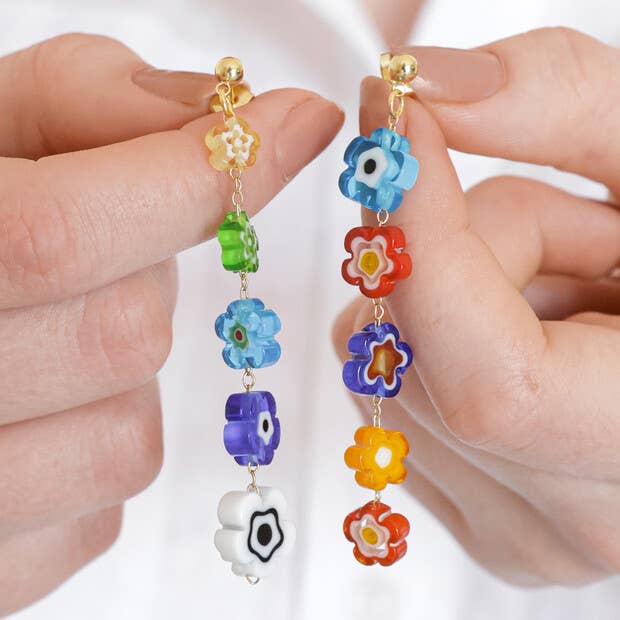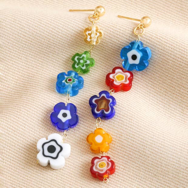 Each earring holds five vibrant flower-shaped beads in a range of unique shades and sizes. They are individually threaded onto a thin gold curb chain and secured in place. With reds, blues, whites, yellows and greens combined to create these colourful accessories, the top of each earring is complete with a polished gold ball stud for added shine. Finished with hypoallergenic sterling silver posts, these earrings fasten with simple butterfly backs for easy securing.Dimensionsapprox. width 1.2cm x height 7cm x depth 0.4cmMade fromglass beads, 14ct gold plated brass, sterling silver posts
