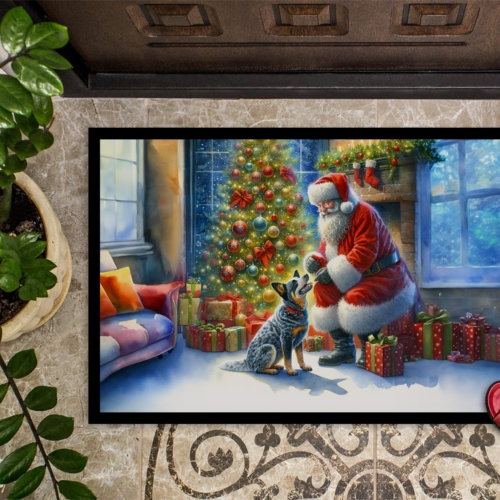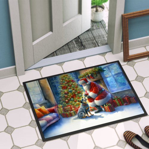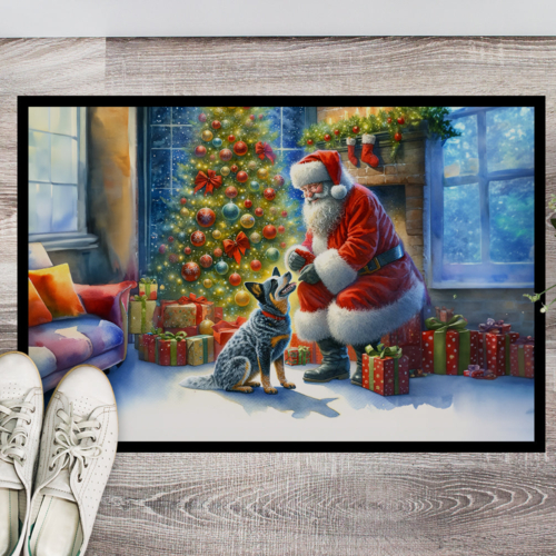 Doormat featuring breed specific Australian Cattle Dog artwork. Celebrate Christmas with this Christmas Doormat. Welcome your guests in style with our Artwork Door Mat, designed to withstand almost any weather condition. This mat, measuring approximately 18 by 27 inches, is held together by durable black binding tape. Its top layer, composed of polyester felt, is dyed with the eye-catching image you see on the mat. A few layers below provide the mat with stability, while its rubber bottom is stamped to help prevent slipping and ensures safety. Our mat works wonderfully as both an indoor or outdoor door mat. For cleaning, simply hose it off with water or use a power washer – no need for any cleaner that produces suds. Avoid scrubbing with a brush, instead, opt for the vacuum on floor setting. Designed manufactured and printed in the USA, this mat is a perfect addition to your porch, outdoor kitchen, entryway, or any indoor space. Its unique design makes it a charming decorative rug that greets your guests and adds a stylish touch to your home decor.