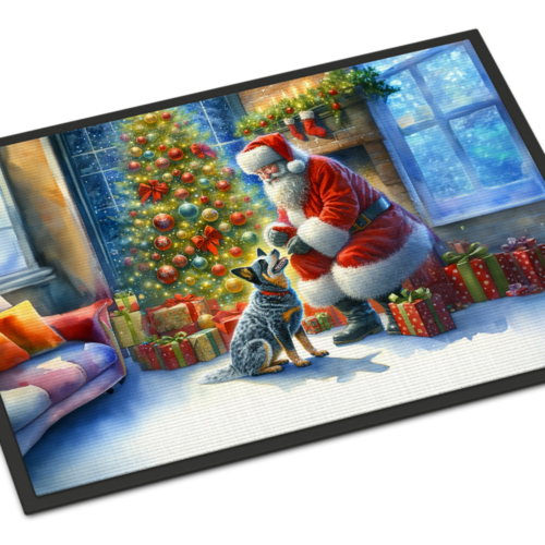 Doormat featuring breed specific Australian Cattle Dog artwork. Celebrate Christmas with this Christmas Doormat. Welcome your guests in style with our Artwork Door Mat, designed to withstand almost any weather condition. This mat, measuring approximately 18 by 27 inches, is held together by durable black binding tape. Its top layer, composed of polyester felt, is dyed with the eye-catching image you see on the mat. A few layers below provide the mat with stability, while its rubber bottom is stamped to help prevent slipping and ensures safety. Our mat works wonderfully as both an indoor or outdoor door mat. For cleaning, simply hose it off with water or use a power washer – no need for any cleaner that produces suds. Avoid scrubbing with a brush, instead, opt for the vacuum on floor setting. Designed manufactured and printed in the USA, this mat is a perfect addition to your porch, outdoor kitchen, entryway, or any indoor space. Its unique design makes it a charming decorative rug that greets your guests and adds a stylish touch to your home decor.