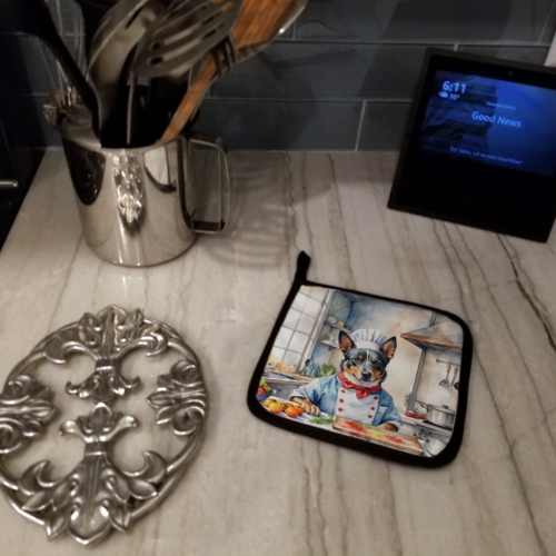 Pair of Pot Holders featuring breed specific Australian Cattle Dog artwork. A Pair of Pot Holders to match your kitchen decor. Made in the USA these are thick and functional. Full color artwork decorates the front polyester fabric of the hot pad and accented by a black trim. Use these at as a trivet for your Thanksgiving or Christmas tablescape. Filled with insulated fabric and quilted for durability. These colorful pot holders will make a great gift for your favorite home cook or executive chef. Each pot holder measures approximately 7 1/2 inches by 7 1/2 inches. A hanging tab is included.