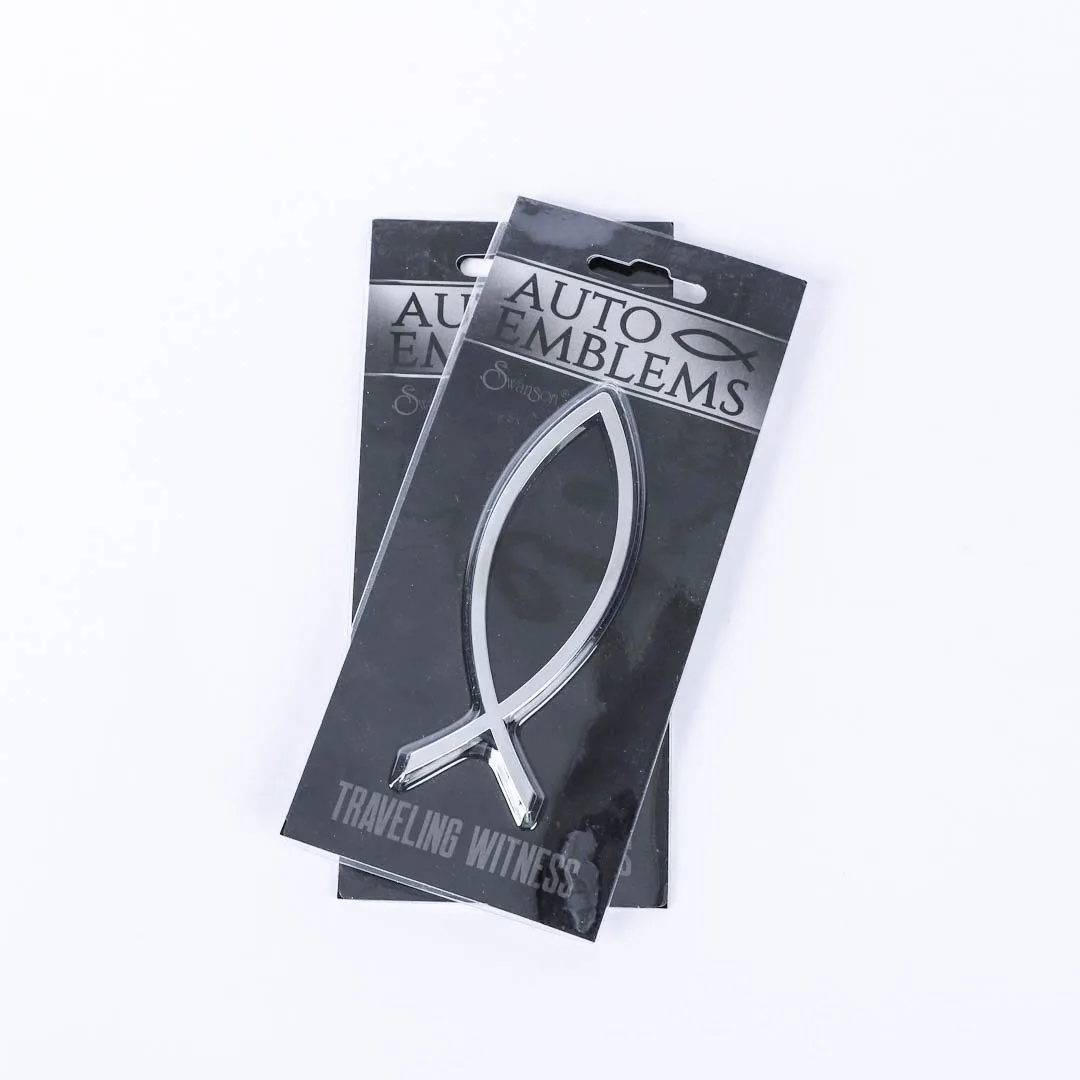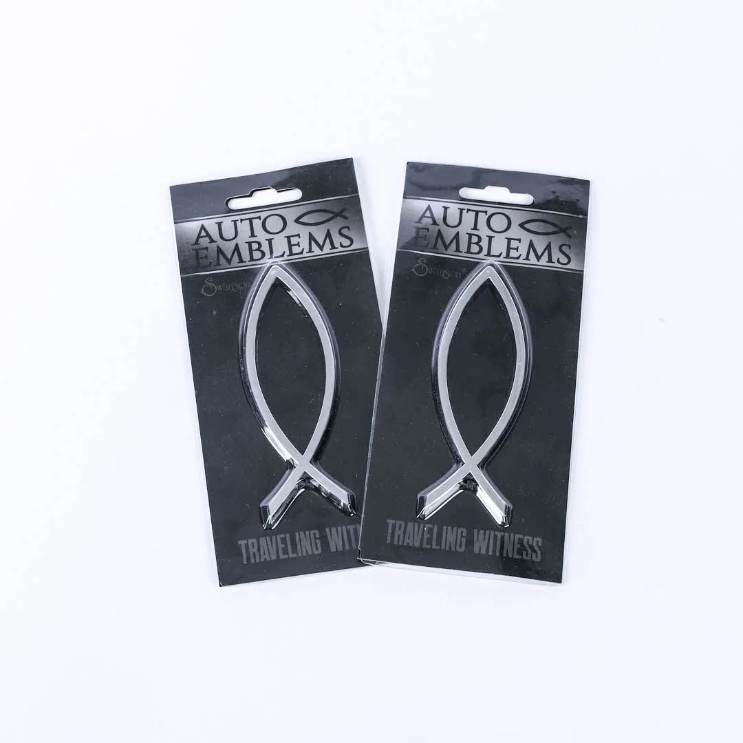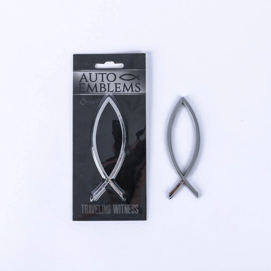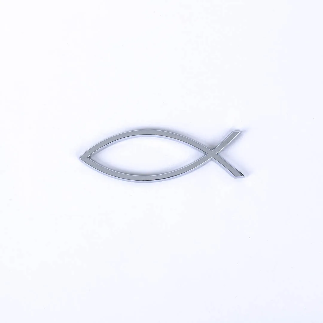 Display your faith wherever you go with our elegant auto emblem, a meaningful and stylish addition to any vehicle. This emblem features a timeless fish design, a classic symbol of faith and Christianity, beautifully crafted in shiny silver with a bold black background. Its striking 3-dimensional design measures 5.5 x 2 inches, making it a perfect size to stand out without being overpowering.