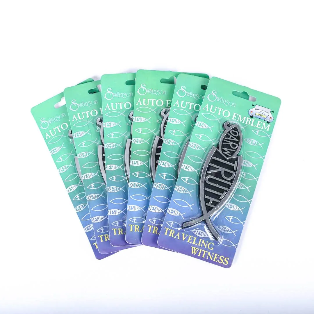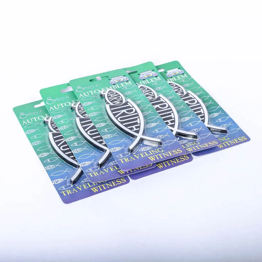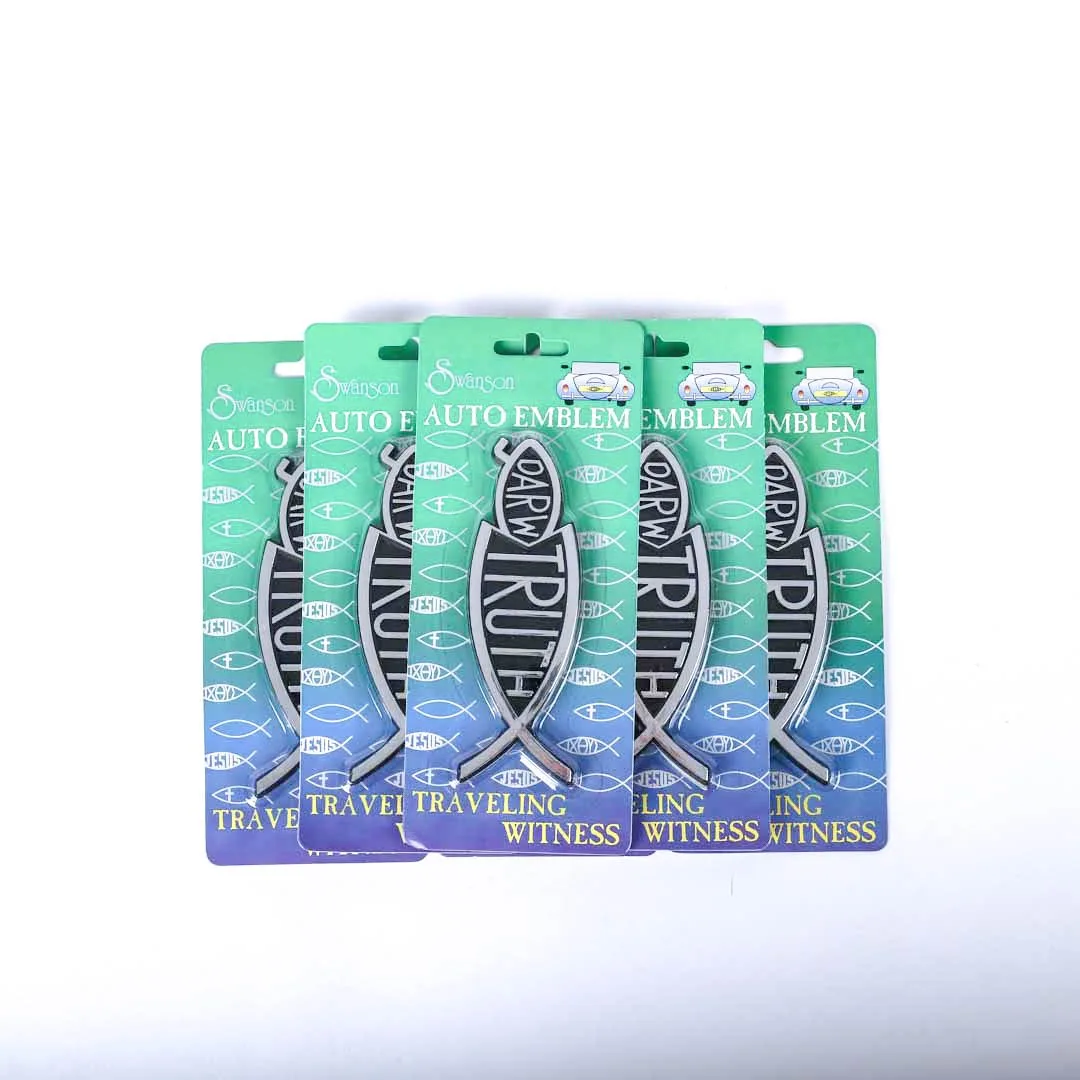 Display your Faith wherever you go with our auto emblem, a beautiful and meaningful addition to any vehicle. This emblem features a Fish of Truth eating the Darwin fish, a symbol of our faith and Christianity. Set in shiny silver with a black background. The 3 Dimensional design is 5.5 x 2 Inches in size. Made of durable, lightweight, high-quality plastic with a fade-resistant foil finish and designed to withstand the elements and the wear and tear of everyday use. It is easy to install, with a simple adhesive backing that can be applied to any clean, flat surface.