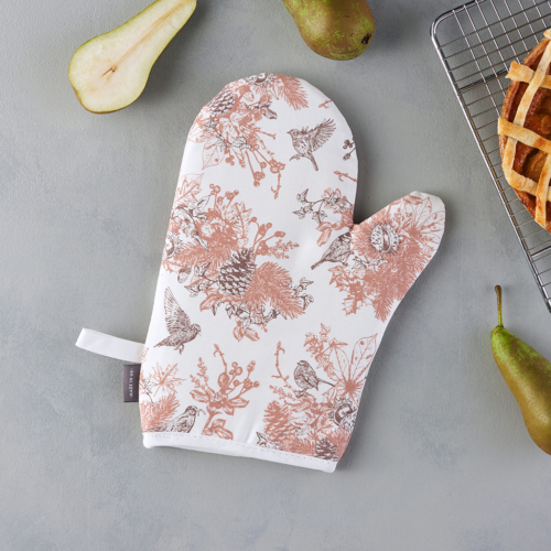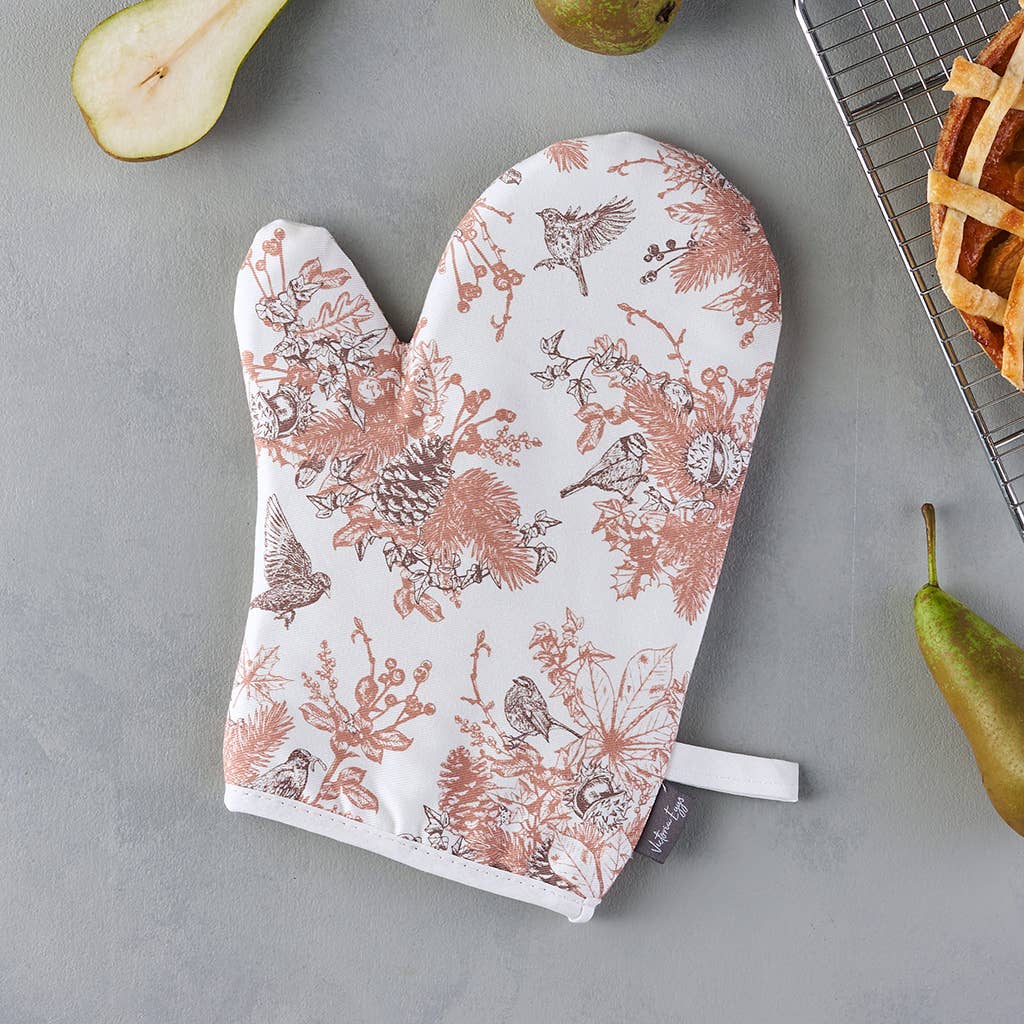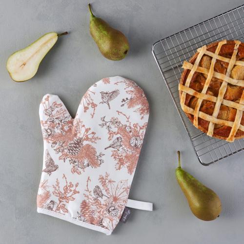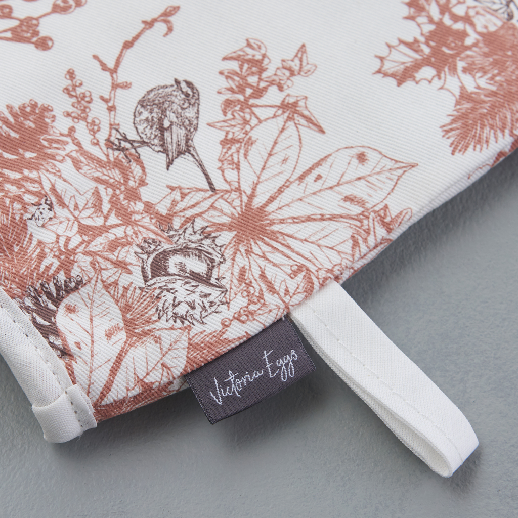 The comforting Autumn Garden collection is filled with curiosity and warmth and was inspired by the smell of pine needles, the crunch of frosty leaves underfoot, and snuggling up next to the fire.- Handmade in the UK.- Screen printed onto 100% cotton. – Dimensions: 29cm x 21cm/ 11.4″ x 8.3″- Washing: Machine washable, max 40 degrees celsius.- Conforms to British Standards 6526:1998 (i.e. they really do protect your hands).- Do not leave on damp/wet surfaces. Keywords: Fall, Autumn, Frost, Cold, pine needles, leaves, robin, winter, conkers, acorns, pine tree, fur tree, brown, pink, copper, birds, wildlife, ladybird, insects, berries, blue tit, made in UK, handmade, environmentally friendly inks, sustainable supply chains.