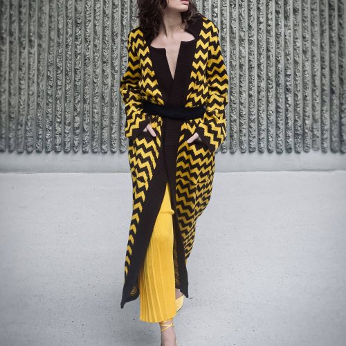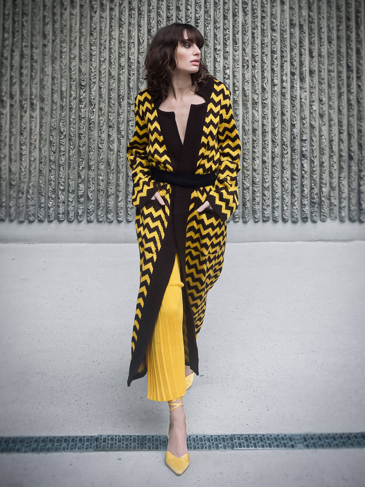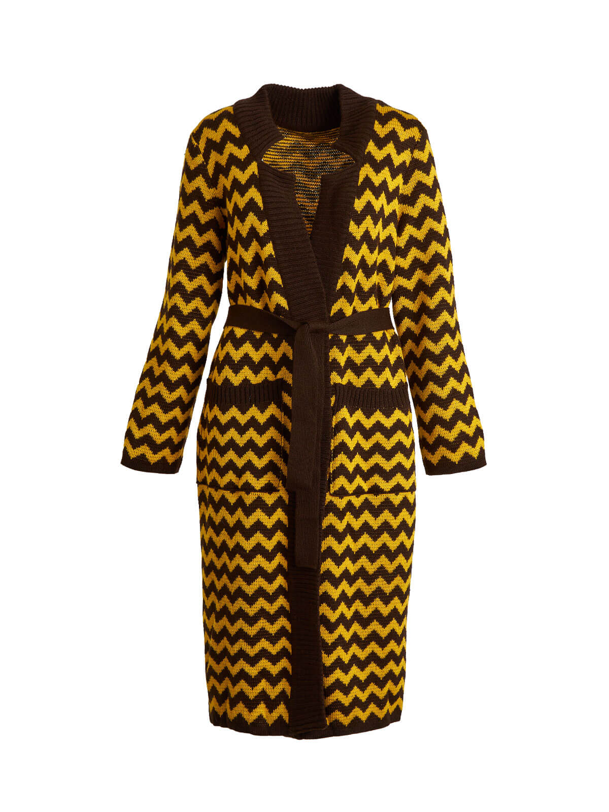 This extra-long cardigan was tailored from wool in a charming yellow and brown ikat look and is once again proof that the designs are so timeless that they outlast trends.