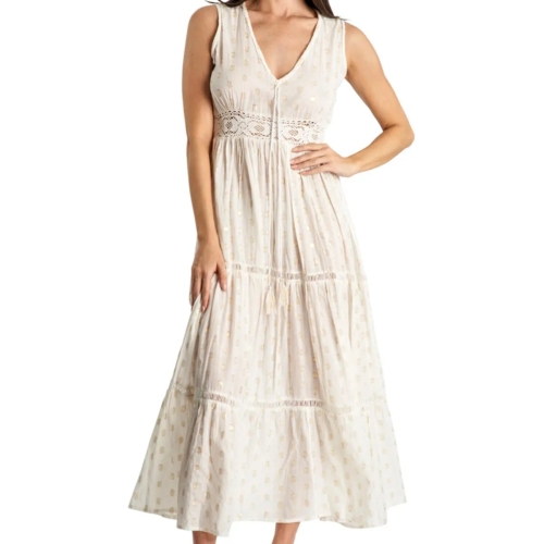 Azalea Tiered Maxi Resort Dress is a stylish and elegant choice Azalea Tiered Maxi Resort Dress by La Moda. Stay cool, effortlessly fashionable, and carefree this season in our sleeveless off-white tiered maxi dress. This pristine off white boho dress, with a V neck and a flared skirt, will never fail to look beautiful and ethereal. Pack of 6 Pcs