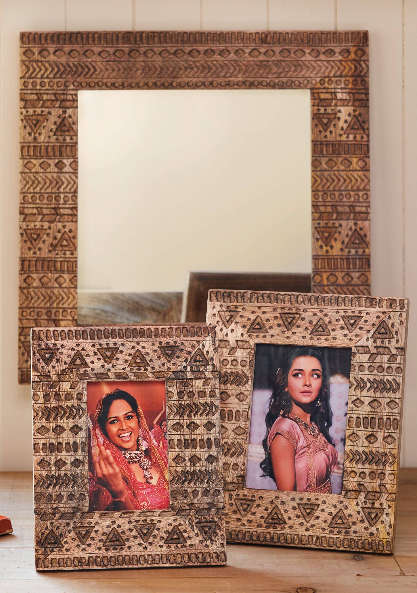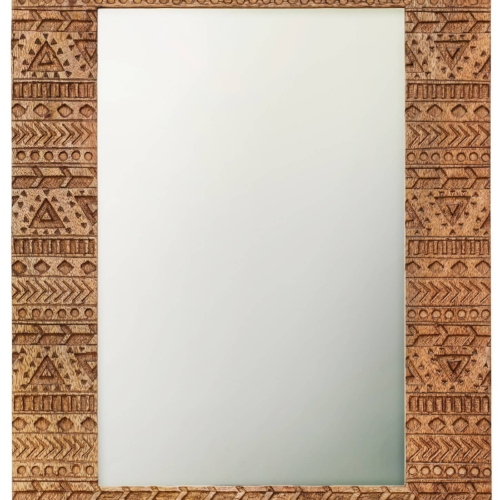 Rectangular ornamental wood framed wall mirror. Our specially selected Aztec range is hand crafted in Saharanpur, well known for wood carving and mango production. These genuine regional goods are skilfully illustrated by hand with an Aztec design, defining the organic texture of the locally sourced mango wood. Natural tones contribute to character and depth. A practical and attractive feature for a variety of environments; cloakrooms, hallways, changing facilities, wash rooms, reception areas. Use to reflect light in a dark space.61.5 x 46.5 x 2cmMango WoodFrom a long established supplier who specialises in bringing amazing craftsmanship of Saharanpur to the market.