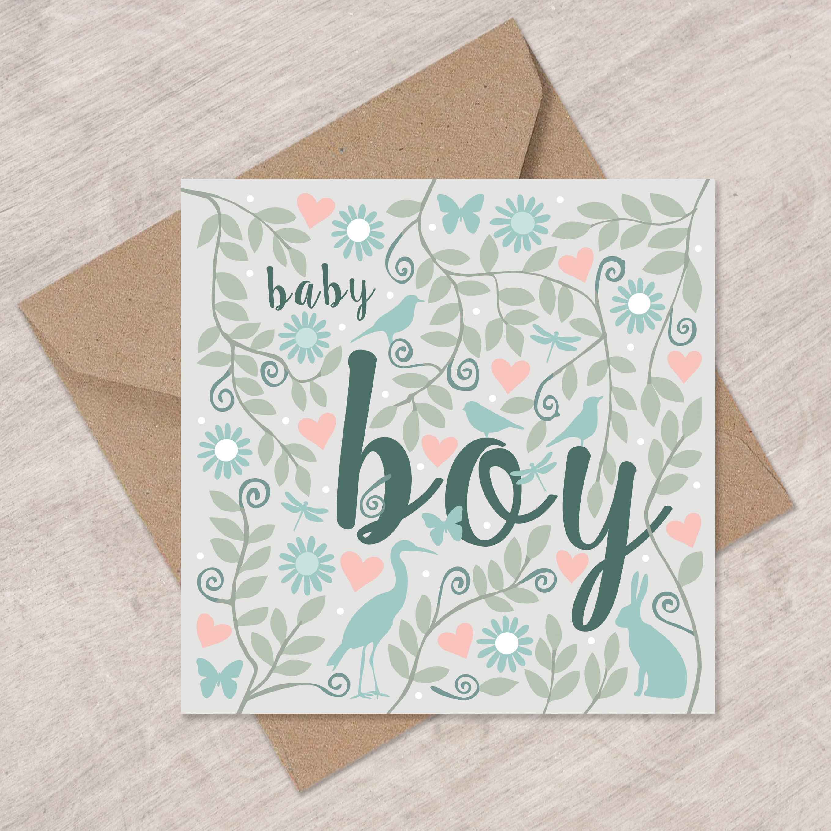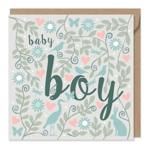 A lovely new baby boy card with animals and leaves.