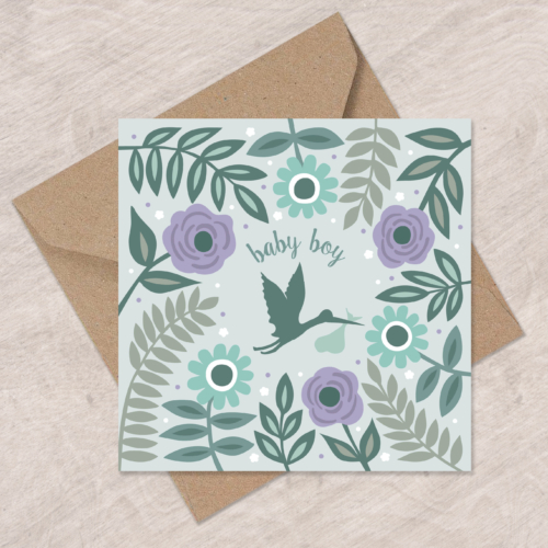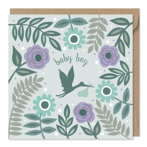 A lovely new baby boy card with stork and flowers.