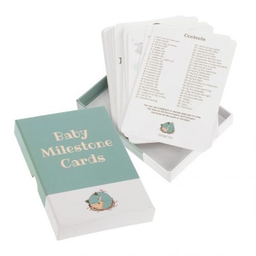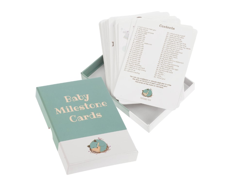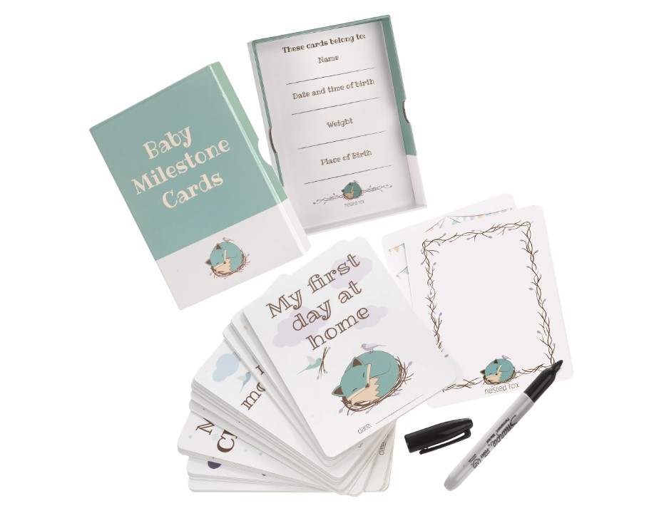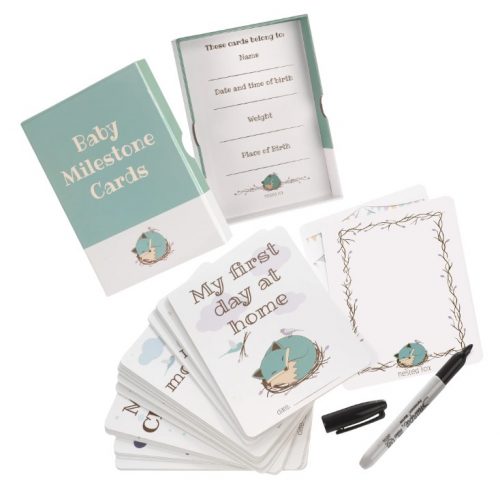 A set of 50 beautifully illustrated A6 Baby Milestone Cards in a keepsake box was designed in the UK by a Mum to be gender-neutral and stylish.
