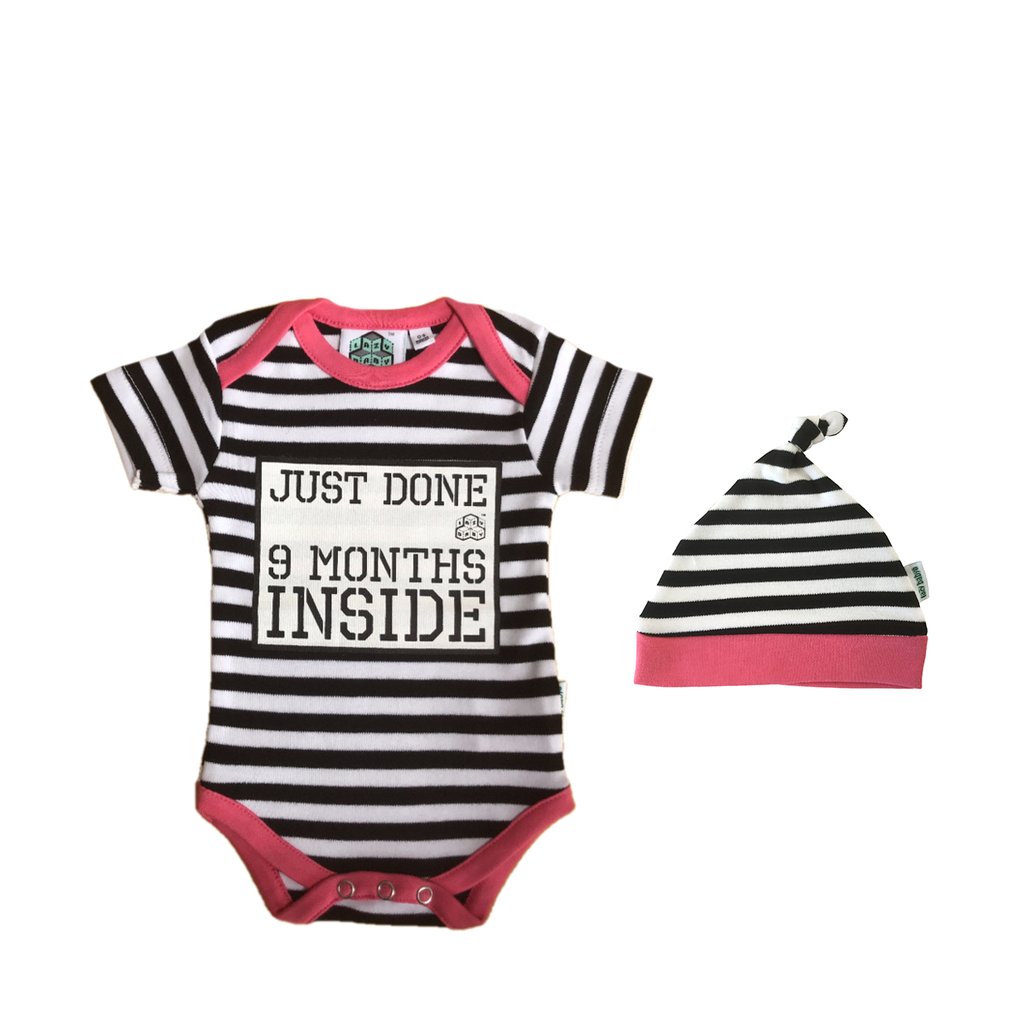 AMUSING – Original and best baby shower gift. “Just done 9 months inside” romper & hat. Guaranteed to bring smiles & laughter to new Mum, Dad and friends.