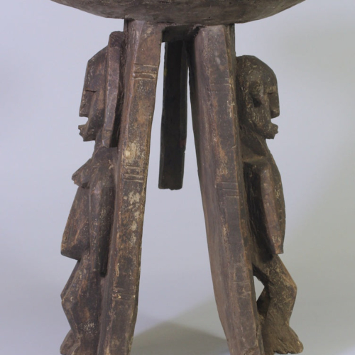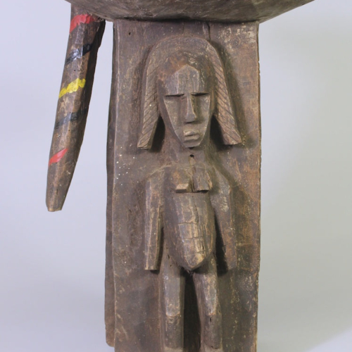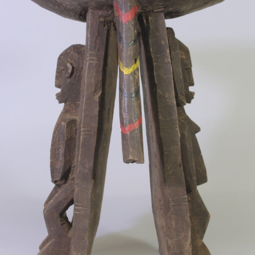 Size: 15.25 x 11.75 (38.125 x 29.375 cm) This wooden stool, carved from a single piece of wood in Mali, stands out from the rest of the stools we have for sale by its unique 2-sided design: 2 flat panels dropping out of the flat round top. Each panel has a figure carved in relief, a male on one side, a female on the other. The round top resting on the panels is painted on the top with a black, white, yellow and red cross design with a black 4-point star in the middle. One side of the panels has a long handle coming out of the round top, painted with black, red, yellow parallel stripe accents. Although both figures represent Bamana people it is the style of the female which, by virtue of its hairstyle, is more recognizably Bamana. Although this stool shows some signs of having been used we do not estimate its age to be very old. Its design is unusual, not common in stools only made for people to buy.