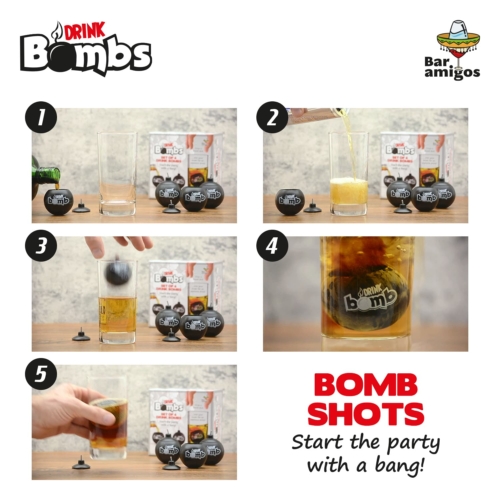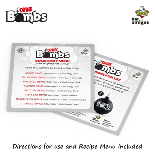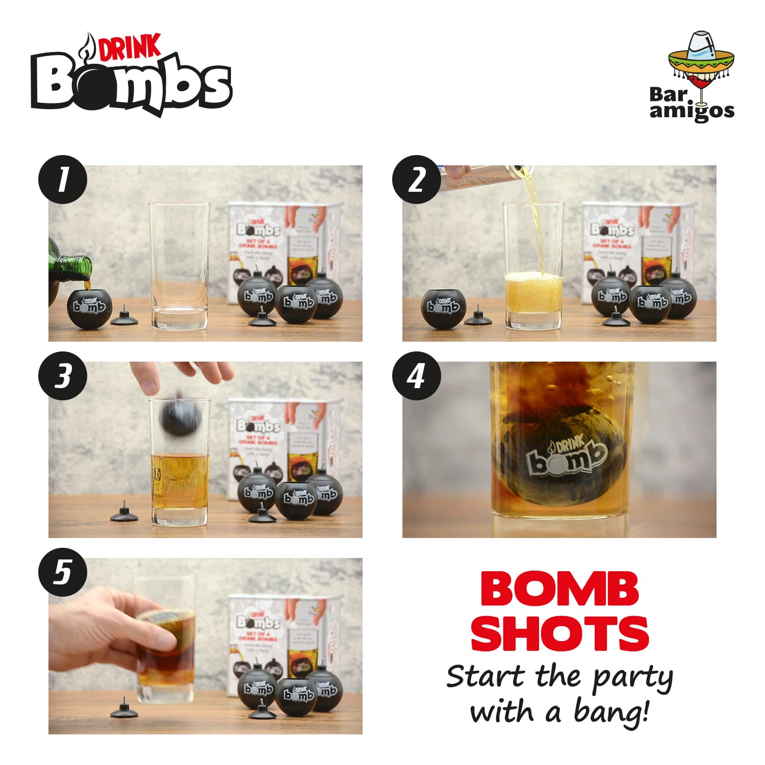 Make your drinks fun with an explosive bomb shot! Fill the bomb with 25ml of your choice of shot and drop it in your glass of mixer. Set of 4 Drink Bombs Start the party with a bang!