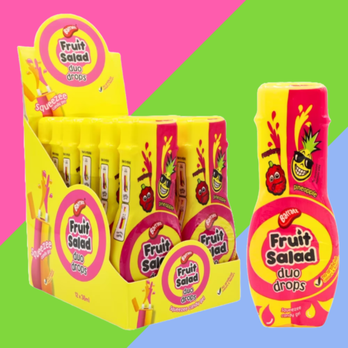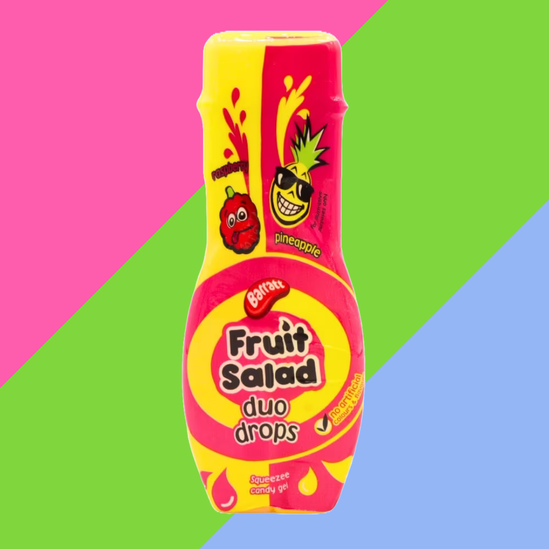 Fruit Salad Duo Drops are the latest exciting innovation to the Barratt range. Duo Drops bring a whole new way to enjoy the classic Fruit Salad flavours. Simply pop the lid and squeeze both sides to experience the incomparable raspberry and pineapple flavours. Fruit Salad Duo Drops are one of the latest new additions to the Barratt range at Hancocks, and they’re sure to be a welcome addition to your novelty sweet range.
