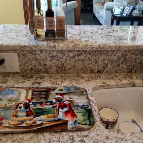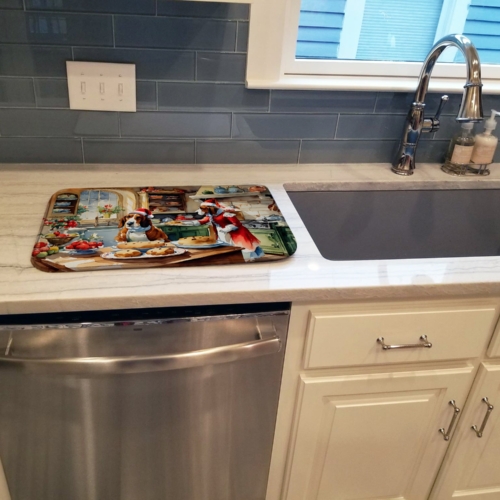 Dish Drying Mat featuring breed specific Basset Hound artwork. Celebrate Christmas with this Christmas Dish Drying Mat. Say goodbye to messy countertops and soggy dish towels with our innovative dish drying mat. Our high-quality dish drying pad is designed to keep your countertops dry while offering a stylish and efficient solution. Whether you’re air drying dishes, glasses, stemware, silverware, pots, pans, bottles, or even fruits and vegetables, our dish mat is the perfect choice. The 14 inches x 22 inches size fits most counters and dish drying racks, and the non-slip design ensures stability. Made with water-absorbent polyester and a polyurethane foam insert, our dish drying mat is not only functional but also durable. It’s machine washable and printed in the USA for long-lasting use. The beautiful artwork adds flair to your kitchen decor, making it a perfect housewarming gift or present for any occasion. Upgrade your kitchen experience with our absorbent and versatile dish drying mat.