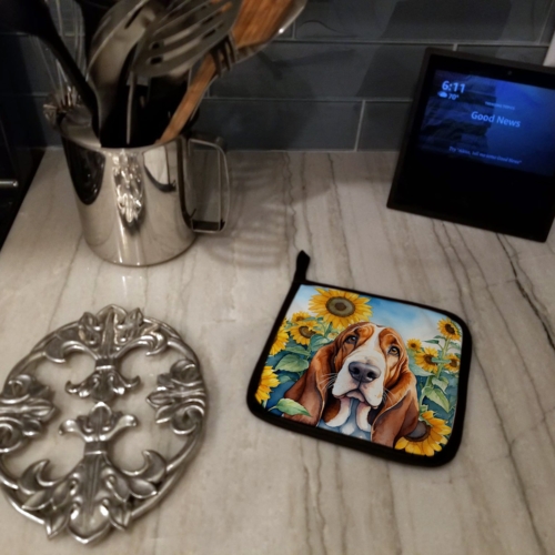 Pair of Pot Holders featuring breed specific Basset Hound artwork. A Pair of Pot Holders to match your kitchen decor. Made in the USA these are thick and functional. Full color artwork decorates the front polyester fabric of the hot pad and accented by a black trim. Use these at as a trivet for your Thanksgiving or Christmas tablescape. Filled with insulated fabric and quilted for durability. These colorful pot holders will make a great gift for your favorite home cook or executive chef. Each pot holder measures approximately 7 1/2 inches by 7 1/2 inches. A hanging tab is included.