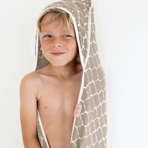 The Witlof for kids bathcape / wrapper ‘Once upon a dream’ is extra large so that you can use it even long after your baby has been born. Because it is double layered, the cape is nice and warm and absorbs very well. There is a loop attached to the cap of the cape, so you can also hang it up. And because of a subtile opening in the middle, the cape can be used in the Maxi-Cosi as well. Comes in a trendy sand/beige and offwhite Moroccan design. The bathcape is finished with an offwhite rib piping. The pompom gives the cape a cool touch.