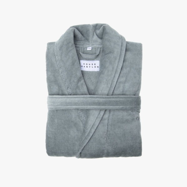 House Babylon’s grey bathrobe is crafted from organic Turkish cotton and are Oeko-Tex certified to be fully free of any harmful chemicals. The terrycloth bathrobe is made of 450 GSM long cotton fibres for maximum fluffiness and absorbency. Branded embroidery is sewn on the chest area. This unisex bathrobe offers a relaxed fit featuring a lapel and capacious pockets. Made in Turkey.
