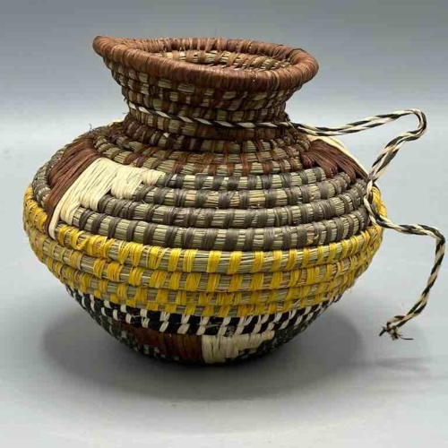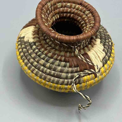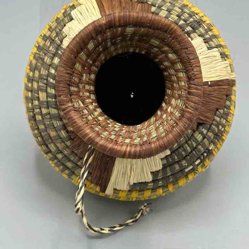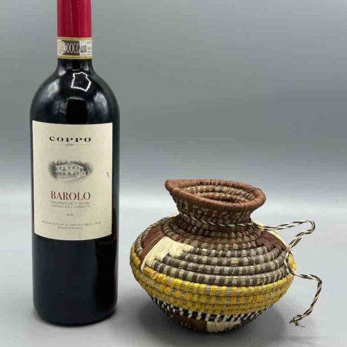 This Batwa baskets incorporates techniques not found in any other African basket. To the coiled grass construction a supplementary raffia woven design is added. The Batwa – the Twa people, a “pygmy” people – live in the border area of southwestern Uganda, northwestern Rwanda and eastern Congo, in the area of the Ruwenzori Mountains, in the Bwindi Impenetrable Forest. They live among a native gorilla population just like we live among whitetail deer. 5 3/4 x 5 5/8” diameter (15 x 14 cm)