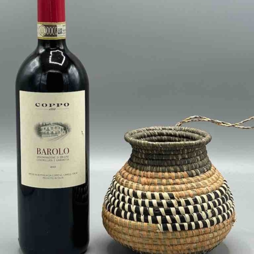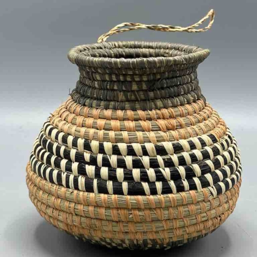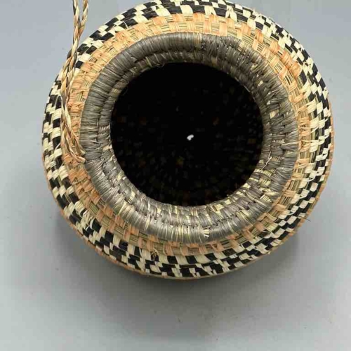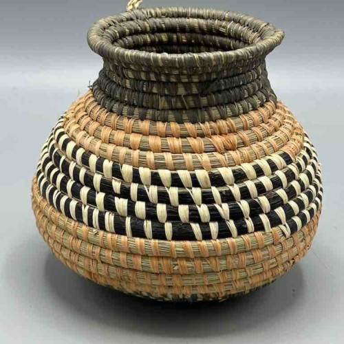 These Batwa baskets incorporate techniques not found in any other African basket. To the coiled grass construction a supplementary raffia woven design is added. The Batwa – the Twa people, a “pygmy” people – live in the border area of southwestern Uganda, northwestern Rwanda and eastern Congo, in the area of the Ruwenzori Mountains, in the Bwindi Impenetrable Forest. They live among a native gorilla population just like we live among whitetail deer. 5 x 5” diameter (13 x 13 cm)