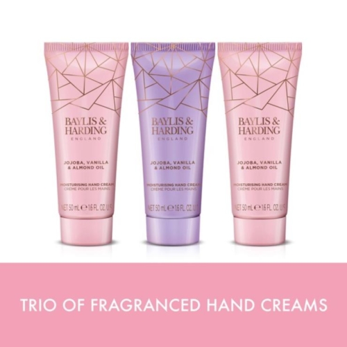 This fabulous luxurious 300ml hand wash and 300ml moisturising hand & body lotion will look perfect next to any sink! We are washing our hands more than ever. Perfect for gentle cleansing and indulgent moisturising of the hands.Feminine blends of jojoba, rich vanilla and sweet almond oil characterise this beautifully opulent collection. Subtle nude pinks are paired with the Colour of the Year for 2023, Digital Lavendar, to elevate this astrological beauty inspired aesthetic. Both feminine and refined, these beautiful colour tones are accented with geometric gold foiling to complete this luxe look.Glamourous and luxurious, our most indulgent fragrance. Gentle notes of vanilla have been blended with subtle notes of almond oil and the sweetness of jojoba to create a truly sensuous and alluring fragrance. Founded in 1970 in the Heart of England, Baylis & Harding is a family business which has grown from humble beginnings to become an award winning, international success. Beautifully made, beautifully packaged and beautifully fragranced, Baylis & Harding create gifts that are opened with delight and products to make both you and your home feel more wonderful. About this item Perfect gift containing three 50 ml hand creams Perfect for your handbag, your car, your desk or whenever your hands need a moisture boost Baylis & Harding’s most indulgent fragrance Jojoba, Vanilla and Almond Oil Not tested on animals and doesn’t contain animal derived ingredients; suitable for vegans Plastic free outer packaging – 100% recyclable