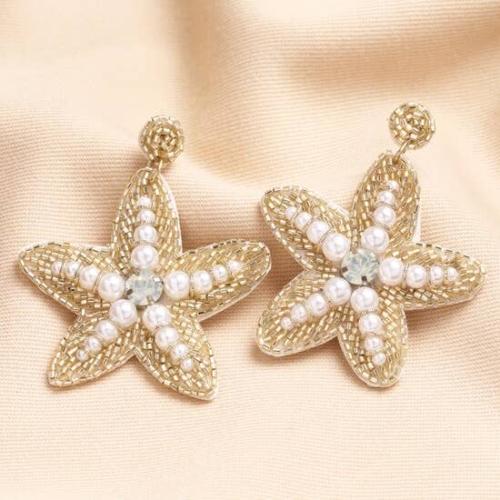 An oversized pair of beaded earringsShaped like a starfishWith gold beads and pearlsPerfect for beach themed collectionsDimensions: width 5cm x height 6cmMade from: bead, imitation pearl
