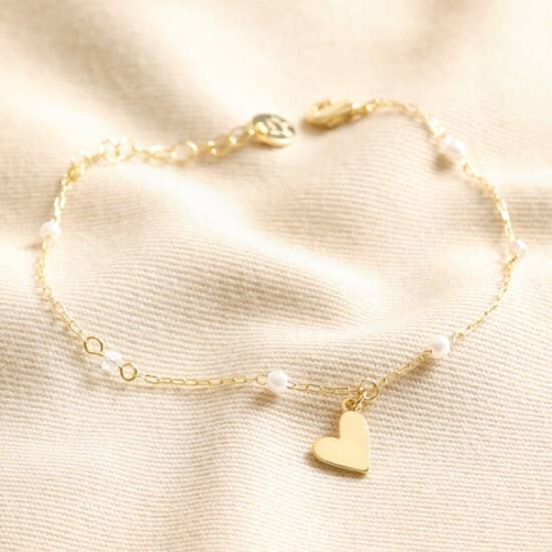 Featuring a chain adorned with faux pearls and sparkling faceted beads, this sweet piece is completed by an adorable heart charm. Fasten it at the length that best suits you using the extender chain and lobster clasp for a comfortable all-day wear. Dimensionsinner circumference – 17cm with a 3cm extender chainMade from14ct gold plated brass, acrylic