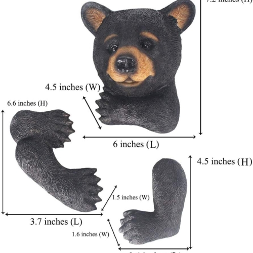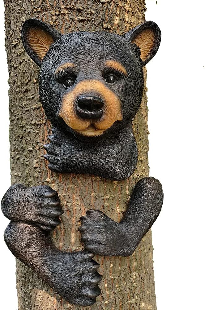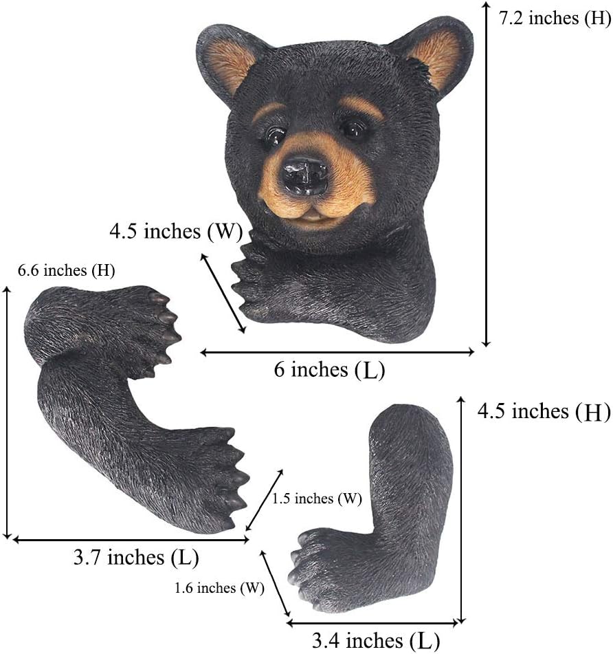 Hand-cast & Hand-painted:our bear tree hugger have realistic shape and fine workmanship,With natural colors and texture to create a stereoscopic piece come to Enrich your garden color and make your garden full of funPerfect garden decor:Hang this realistic bear statue on the tree trunk (the size should not be too large) to make your courtyard garden full of creativity and lifeMaterial: this bear outdoor decor use highly detailed sculpted resin, very durable, Can resist outdoor factorsSize for our bear tree peeker -Face: 6nch (L) X4.5inch (W) X 7.2inch (H) ,Left foot: 3.7nch (L) X1.5inch (W) X6.6inch (H) ,Right foot: 3.4nch (L) X1.6inch (W) X 4.5inch (H)