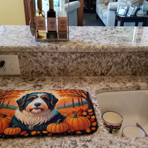 Dish Drying Mat featuring breed specific Bearded Collie artwork. Say goodbye to messy countertops and soggy dish towels with our innovative dish drying mat. Our high-quality dish drying pad is designed to keep your countertops dry while offering a stylish and efficient solution. Whether you’re air drying dishes, glasses, stemware, silverware, pots, pans, bottles, or even fruits and vegetables, our dish mat is the perfect choice. The 14 inches x 22 inches size fits most counters and dish drying racks, and the non-slip design ensures stability. Made with water-absorbent polyester and a polyurethane foam insert, our dish drying mat is not only functional but also durable. It’s machine washable and printed in the USA for long-lasting use. The beautiful artwork adds flair to your kitchen decor, making it a perfect housewarming gift or present for any occasion. Upgrade your kitchen experience with our absorbent and versatile dish drying mat.