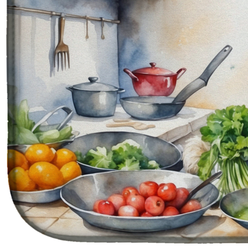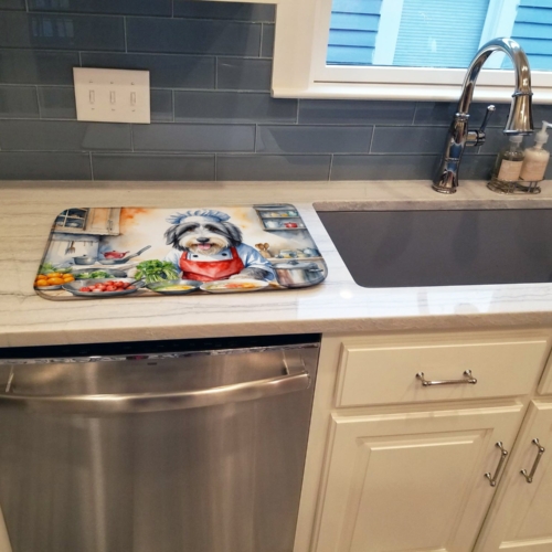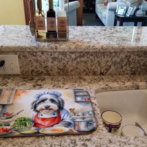 Dish Drying Mat featuring breed specific Bearded Collie artwork. Say goodbye to messy countertops and soggy dish towels with our innovative dish drying mat. Our high-quality dish drying pad is designed to keep your countertops dry while offering a stylish and efficient solution. Whether you’re air drying dishes, glasses, stemware, silverware, pots, pans, bottles, or even fruits and vegetables, our dish mat is the perfect choice. The 14 inches x 22 inches size fits most counters and dish drying racks, and the non-slip design ensures stability. Made with water-absorbent polyester and a polyurethane foam insert, our dish drying mat is not only functional but also durable. It’s machine washable and printed in the USA for long-lasting use. The beautiful artwork adds flair to your kitchen decor, making it a perfect housewarming gift or present for any occasion. Upgrade your kitchen experience with our absorbent and versatile dish drying mat.