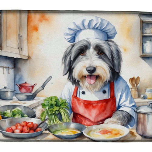 Dish Drying Mat featuring breed specific Bearded Collie artwork. Say goodbye to messy countertops and soggy dish towels with our innovative dish drying mat. Our high-quality dish drying pad is designed to keep your countertops dry while offering a stylish and efficient solution. Whether you’re air drying dishes, glasses, stemware, silverware, pots, pans, bottles, or even fruits and vegetables, our dish mat is the perfect choice. The 14 inches x 22 inches size fits most counters and dish drying racks, and the non-slip design ensures stability. Made with water-absorbent polyester and a polyurethane foam insert, our dish drying mat is not only functional but also durable. It’s machine washable and printed in the USA for long-lasting use. The beautiful artwork adds flair to your kitchen decor, making it a perfect housewarming gift or present for any occasion. Upgrade your kitchen experience with our absorbent and versatile dish drying mat.