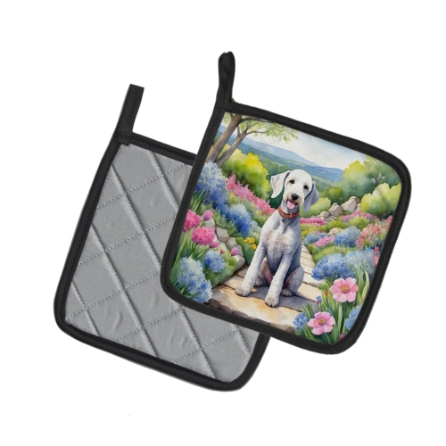 Pair of Pot Holders featuring breed specific Bedlington Terrier artwork. A Pair of Pot Holders to match your kitchen decor. Made in the USA these are thick and functional. Full color artwork decorates the front polyester fabric of the hot pad and accented by a black trim. Use these at as a trivet for your Thanksgiving or Christmas tablescape. Filled with insulated fabric and quilted for durability. These colorful pot holders will make a great gift for your favorite home cook or executive chef. Each pot holder measures approximately 7 1/2 inches by 7 1/2 inches. A hanging tab is included.