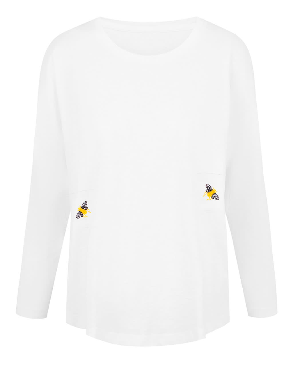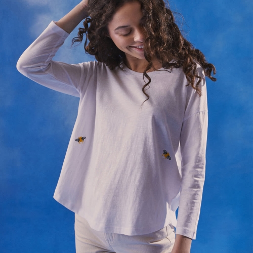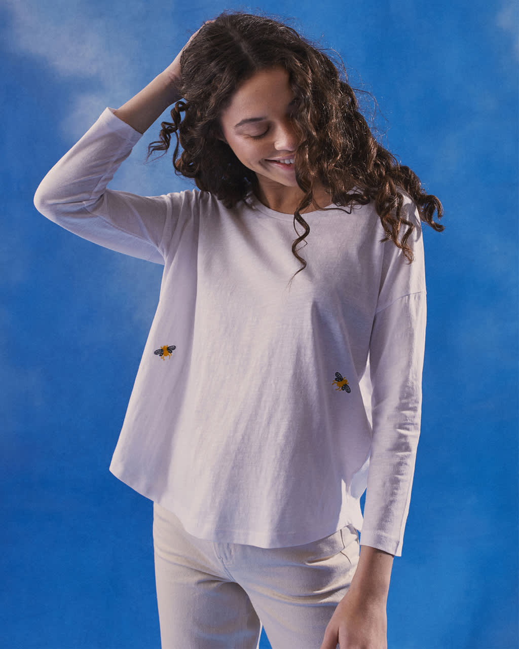 Whether your at work or just relaxing at home, this t-shirt is always a great choice. It has a playful design featuring two yellow & black bees that pairs effortlessly with your trousers, jeans, or even your dungarees. The lightweight organic cotton fabric will remain breathable and has a natural feel on the skin. The functional all-season style looks great any time of the year.