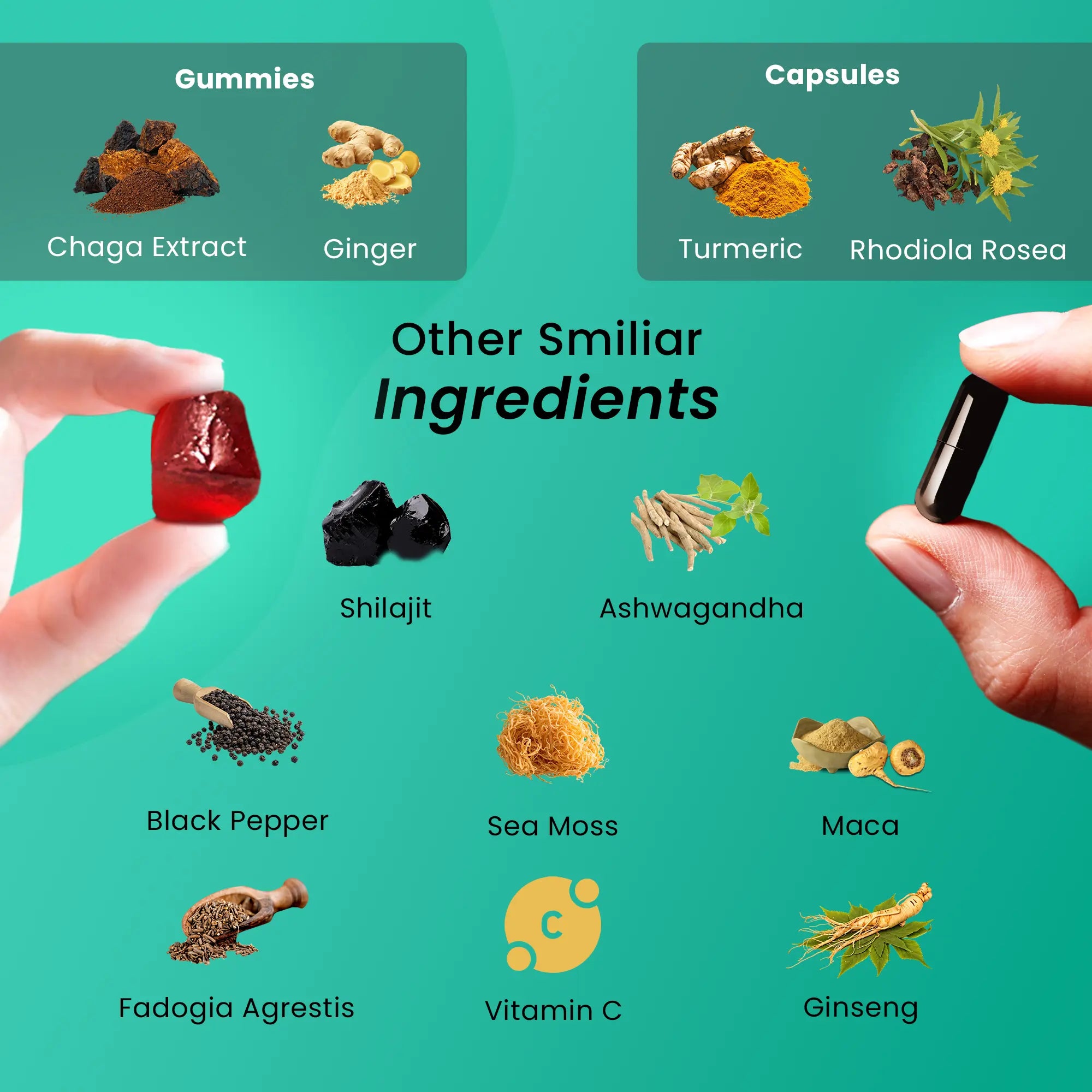 Himalayan Shilajit + Herbal Blend: Each capsule includes a extract of Shilajit, Ashwagandha, Sea Moss, and Maca Root—formulated for modern daily wellness.One Capsule a Day – No Preparation Needed: No bitter taste or mixing—just one easy-to-swallow, vegan-friendly capsule per day.For Men & Women – Endurance & Balance: Designed for adults seeking support for endurance, immune balance, and general vitality.
