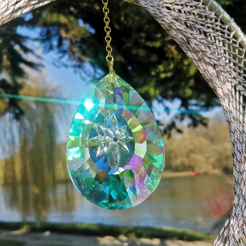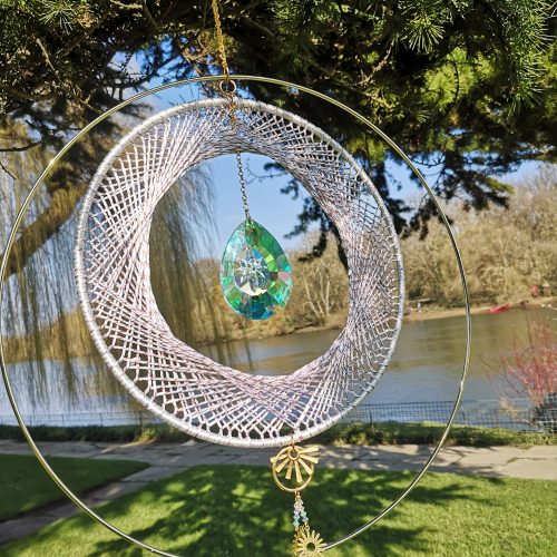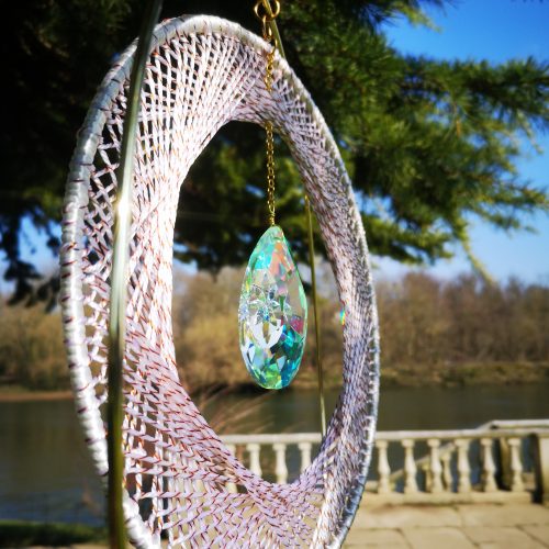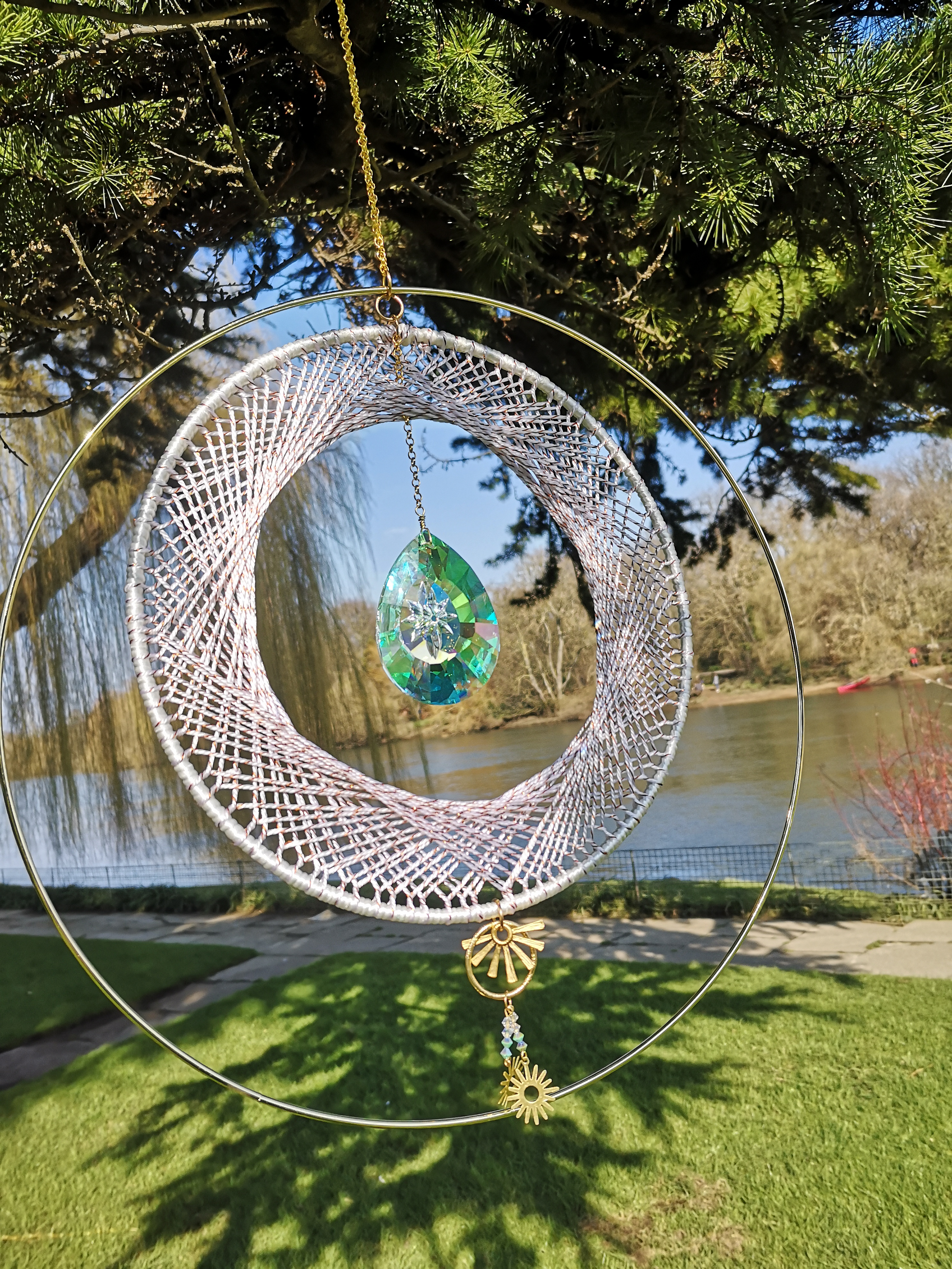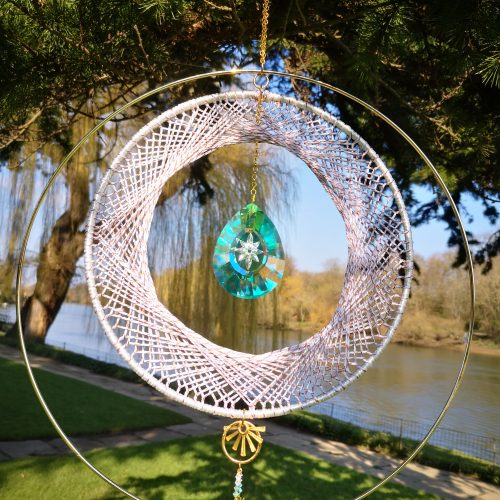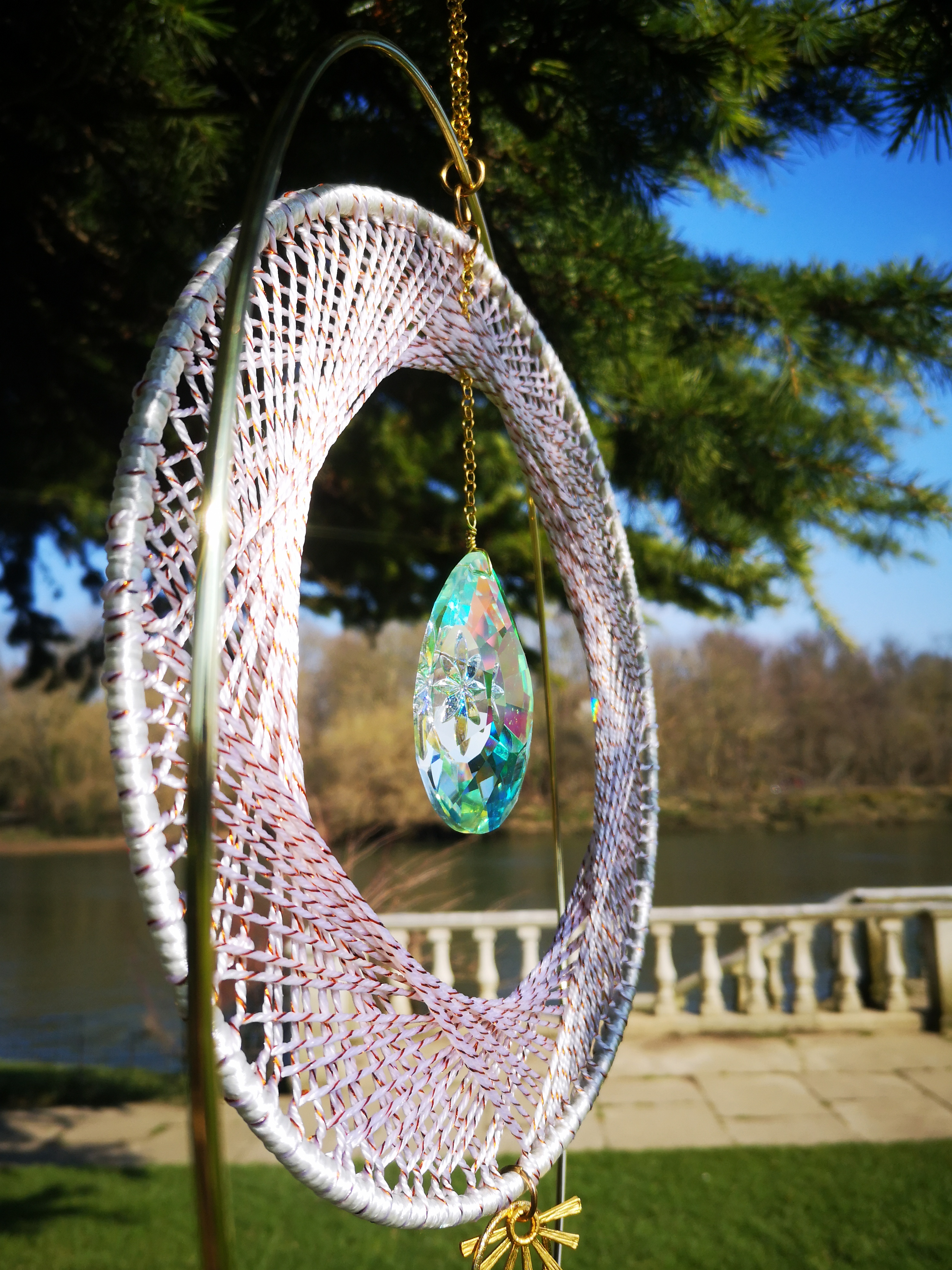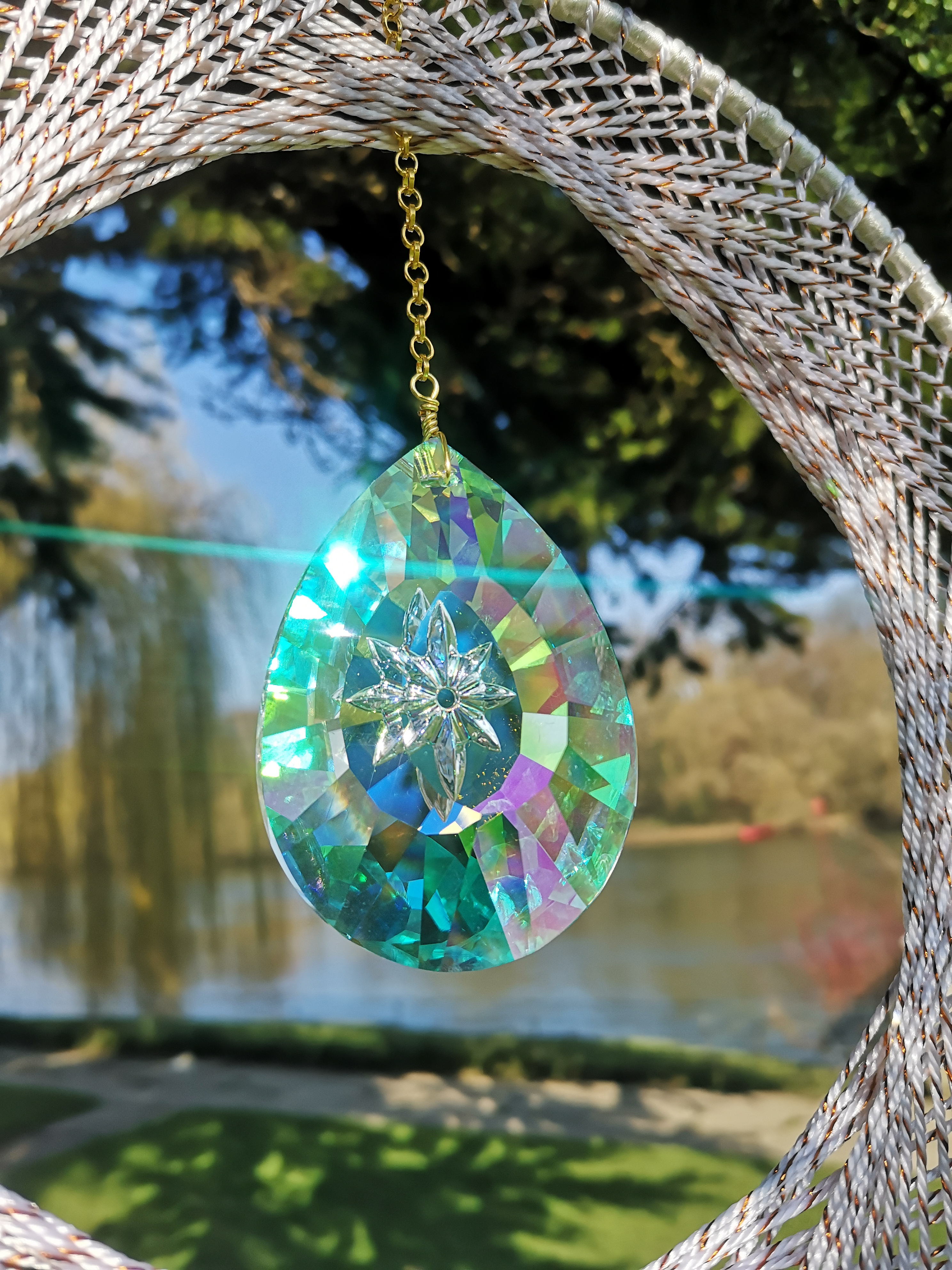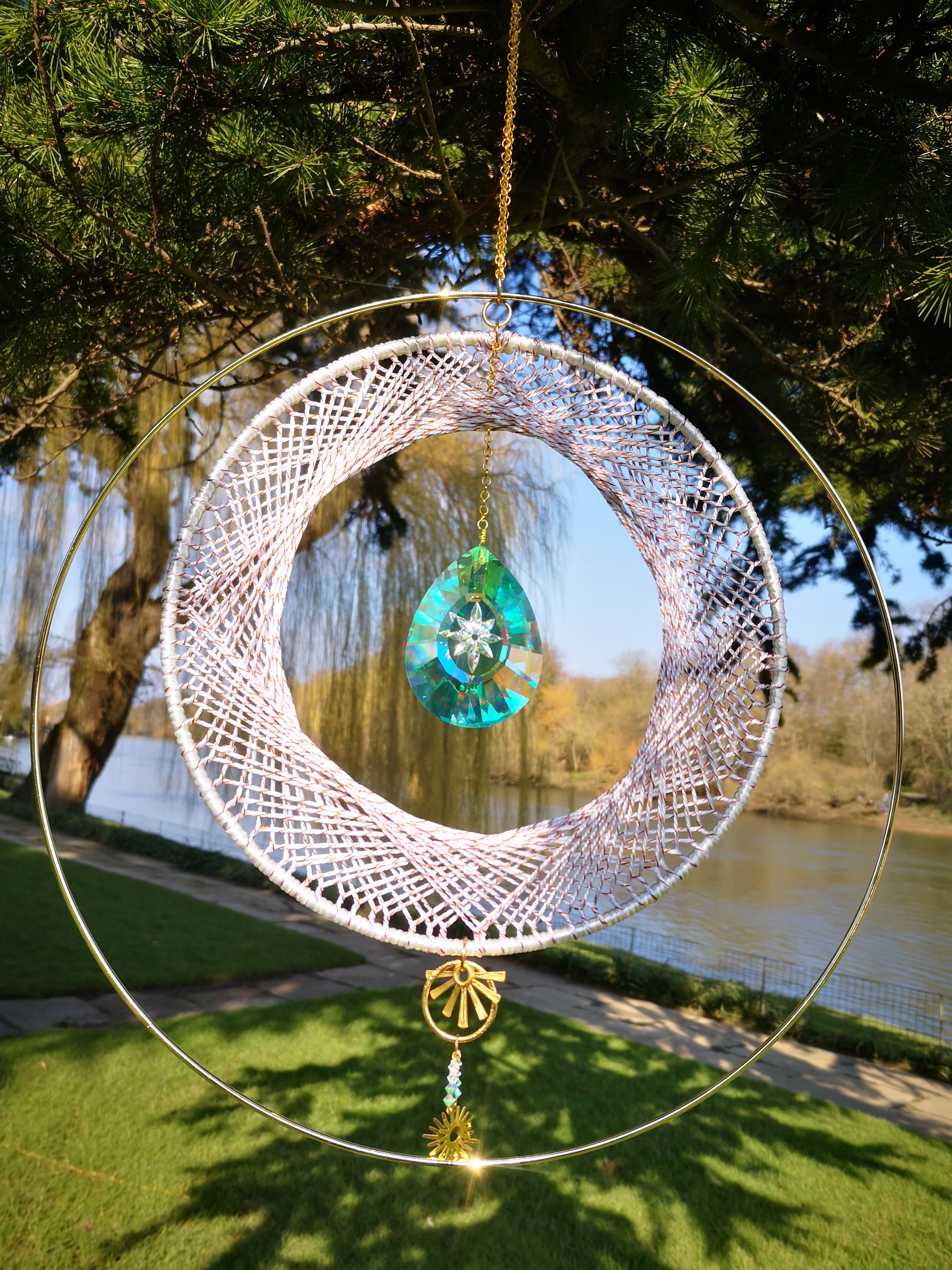 A beautiful facetted pear drop crystal is adorned with geometric woven patterning and a glistening golden 35cm ring. Just watch the sunbeams go stellar!
